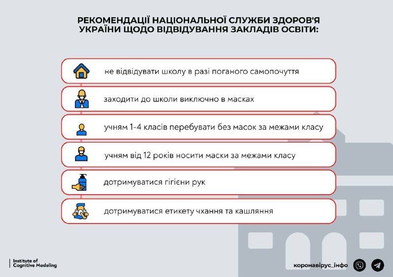 НЗСУ советует школьникам заходить в школу только в масках. Ученикам 1-4 классов за пределами класса находиться без масок, а вот школьникам старше 12 лет наоборот носить маски вне помещения класса. Также детям важно соблюдать гигиену рук, этикет чихания и кашля.