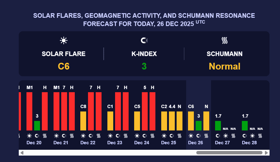 В субботу, 27 декабря, ожидается магнитная буря зелёного уровня. Она будет соответствовать К-индексу 1.7 (зеленый уровень).