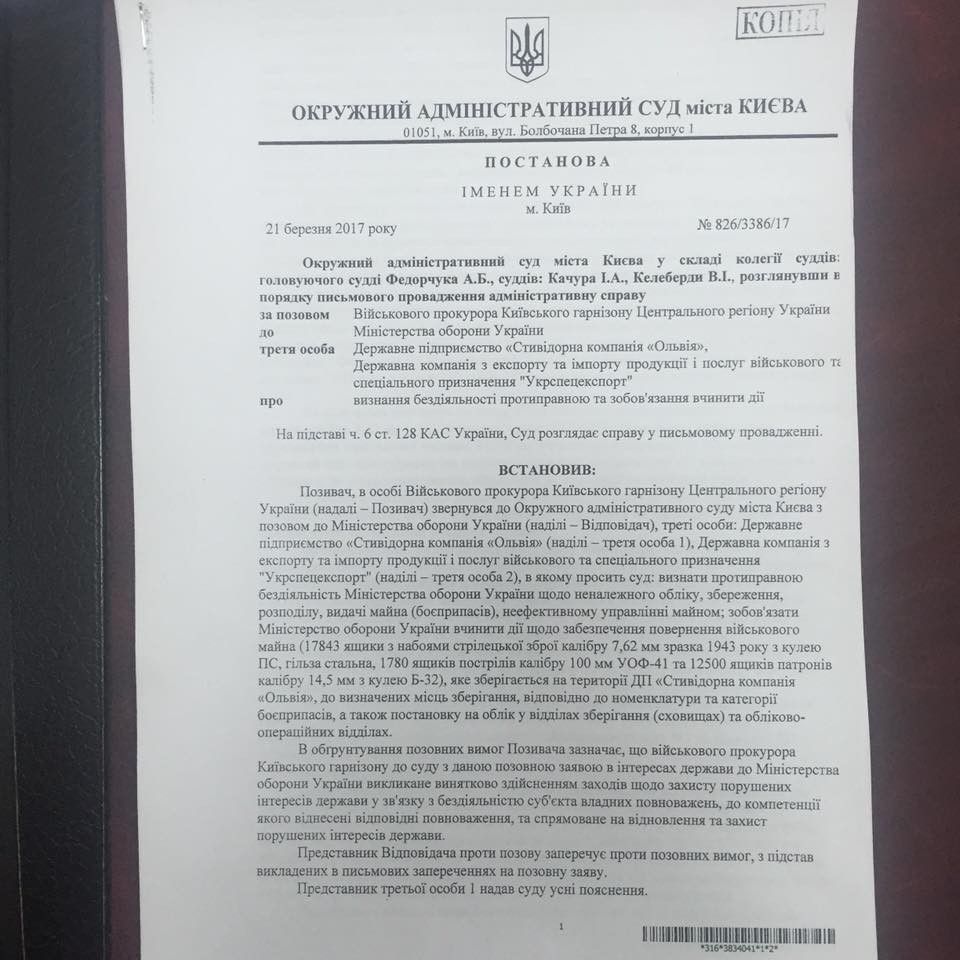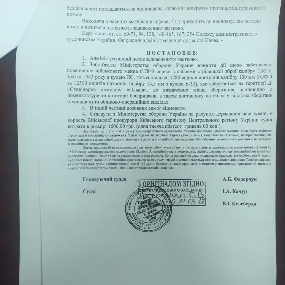 "МО Украины обязано обеспечить возврат военного имущества (17 843 ящиков патронов стрелкового оружия калибра 7.62 мм, 1780 ящиков артиллерийских снарядов калибра до 100мм противотанковой пушки МТ-12 "Рапира" и 12 500 ящиков патронов калибра 14.5 мм до танкового пулемета ККВТ), которые с 2000 года безосновательно хранились на территории ГП "Стивидорная компания "Ольвия" (бывший специализированный порт "Октябрьский"), вследствие невыполнения ГК "Укрспецэкспорт" внешнеэкономического контракта с Республикой Эфиопия и выбывших с учета воинских частей", - написал он.