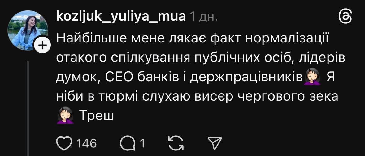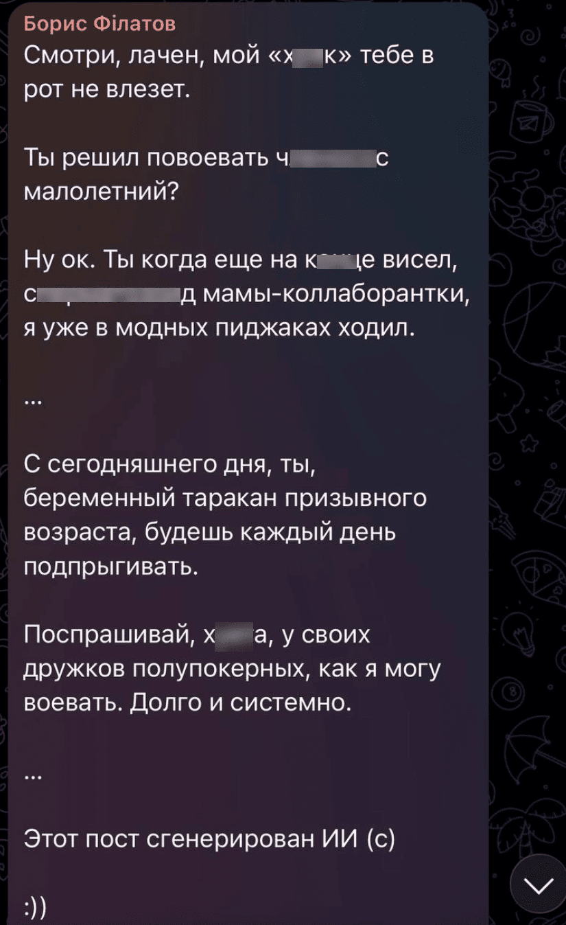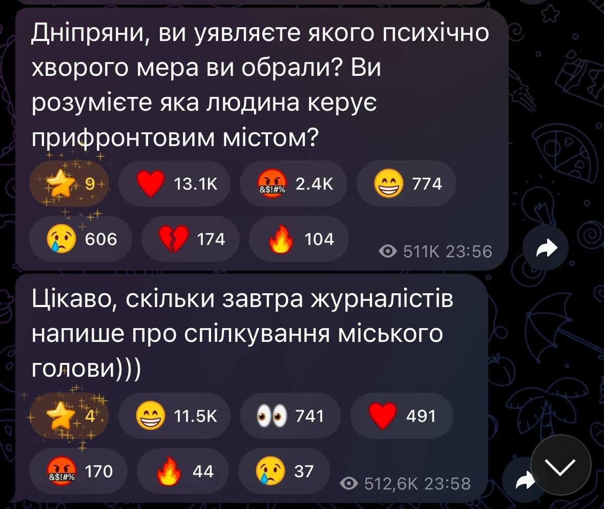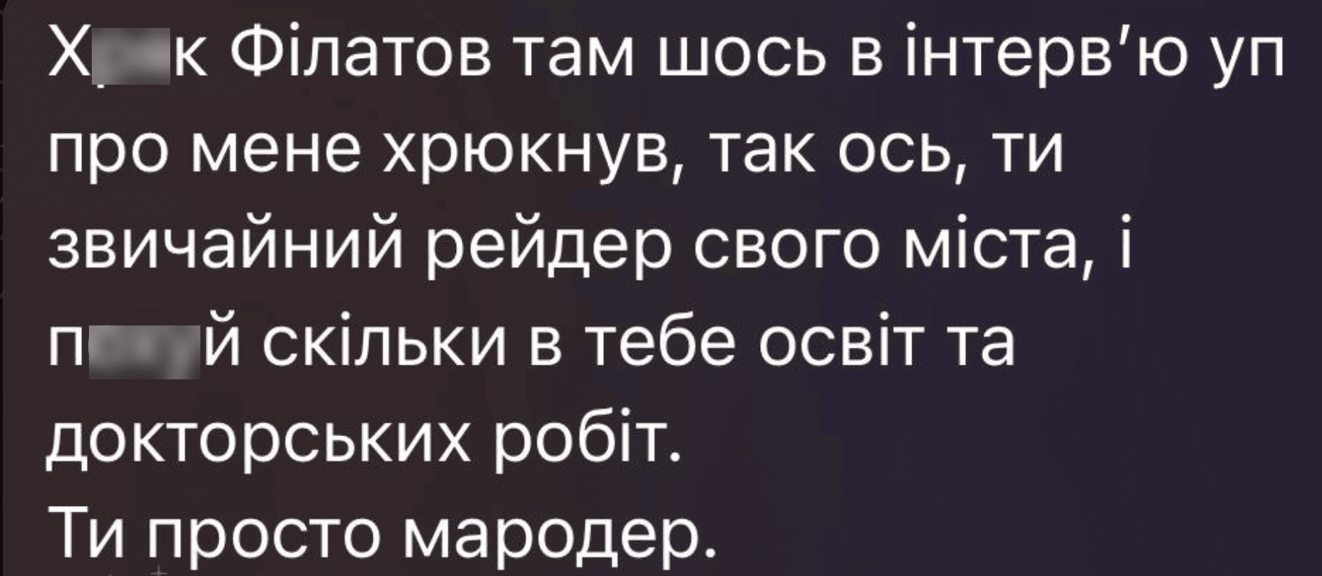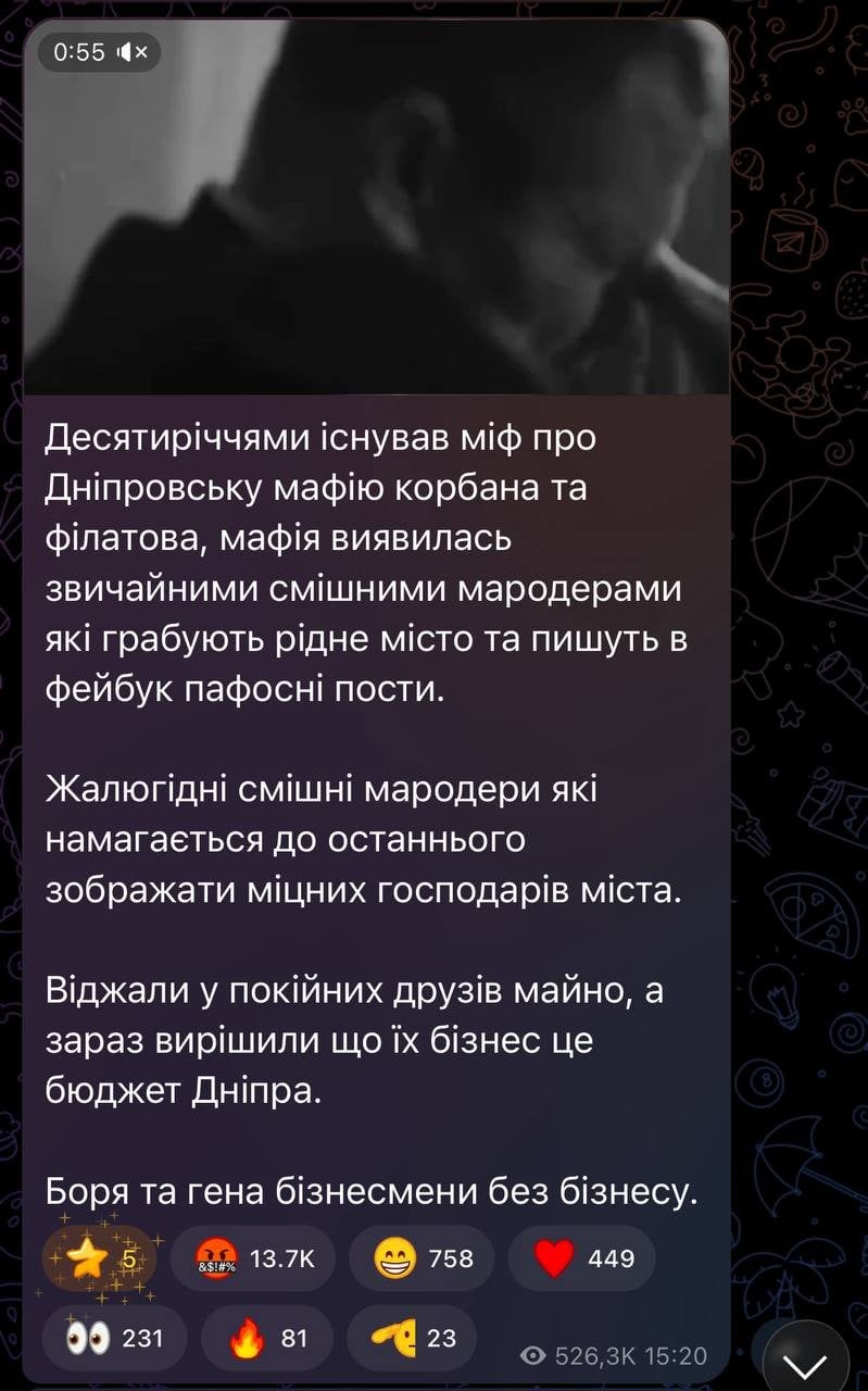 «Я могу вам не нравиться, вы можете меня ненавидеть и т.д., но, скорее всего, лично я вам ничего не сделал и копейки нигде не украл, и поэтому могу писать о коррупции и защищать антикоррупционные органы. Филатов — городской голова, который грабит город уже кучу лет, все это знают, но почему-то молчат и тихонько смеются, когда он ведет себя, как последнее бы**о», — позже написал днепровский блогер.