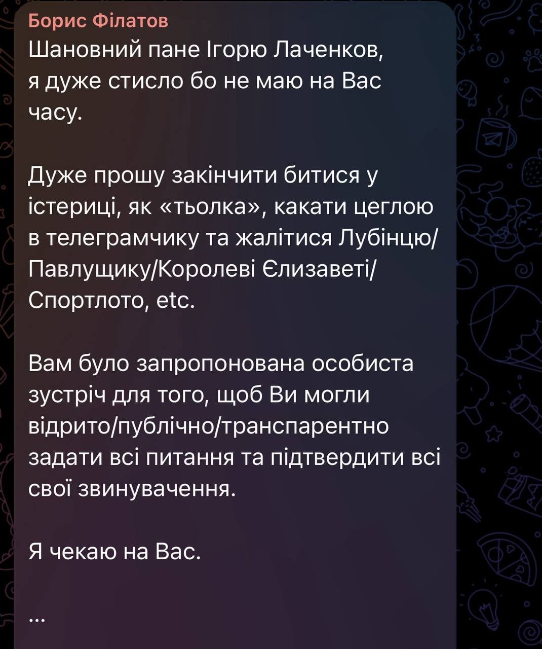 Со своей стороны Игорь Лаченков заявил, что мэр Днепра «обиделся на правду». Блогер подчеркнул, что расценивает сообщение главы города как личную угрозу. Кроме того, он намекнул, что Филатов мог писать свой пост, находясь в нетрезвом состоянии.