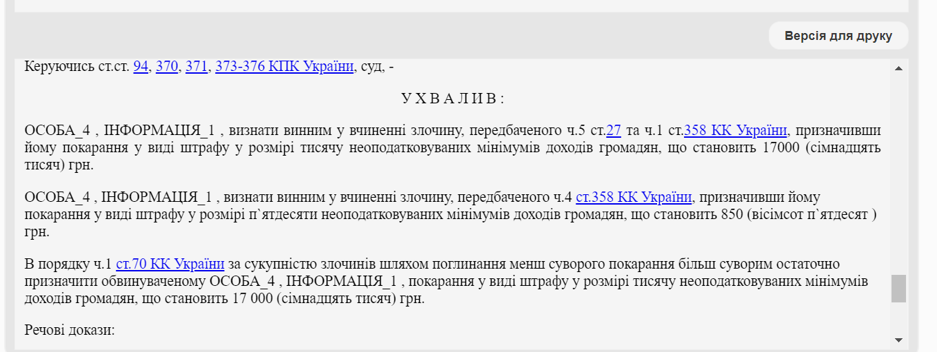 На суде украинец вину признал и раскаялся. Суд признал мужчину виновным по ч.5 ст.27 и ч.1 ст.358 УК Украины и присудил 17 тыс. грн штрафа.