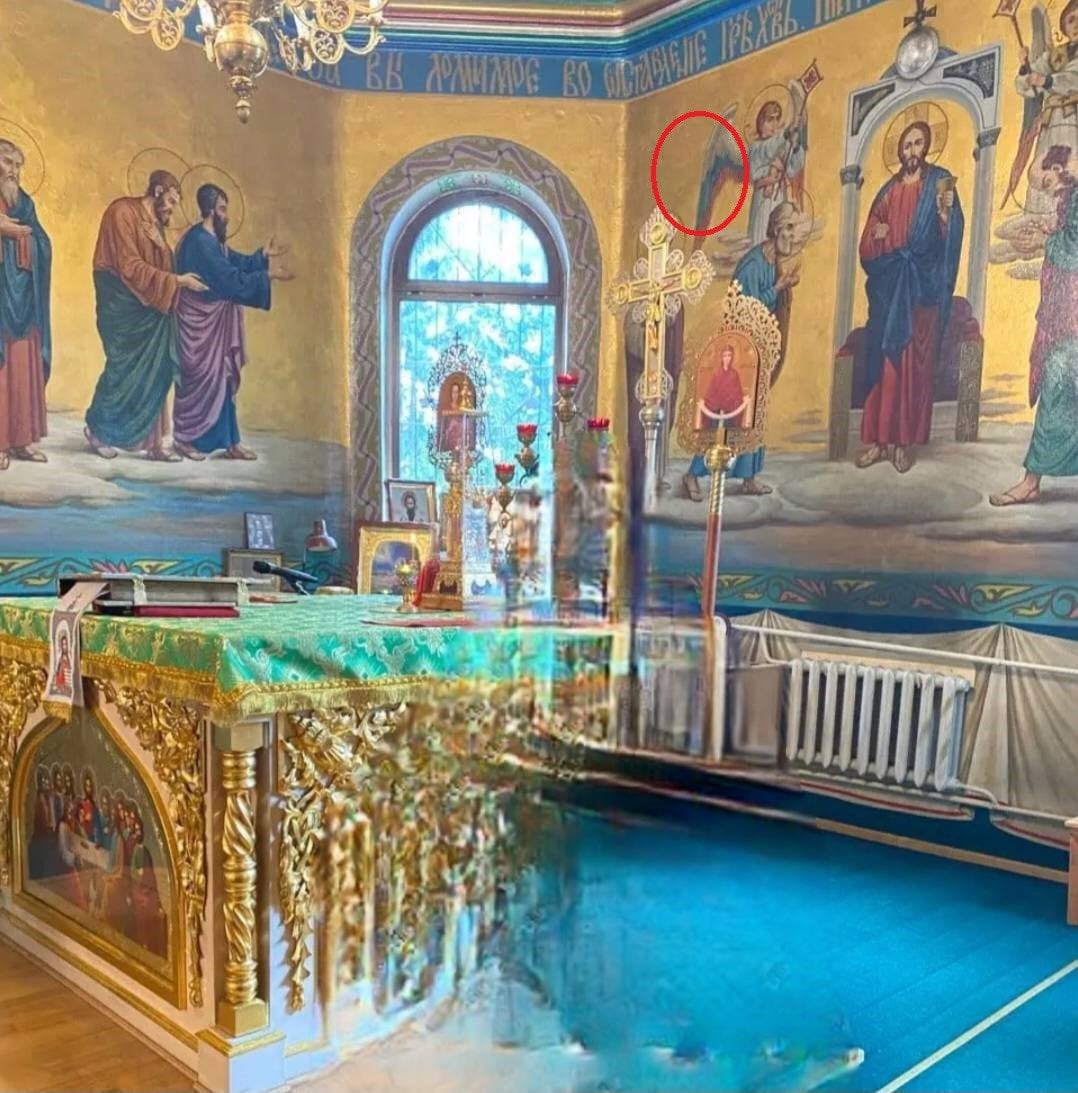Роман Грищук обратил внимание на фото одного из попов Московского патриархата. На фото поп МП сфотографирован в алтаре этой церкви, а на заднем фоне виден российский триколор. И не где-нибудь, а цинично — на крыльях ангела. На изображении четко видна фигура ангела, чьи крылья окрашены в белый, синий и красный цвета, полностью совпадающий с последовательностью цветов флага страны-агрессора.
