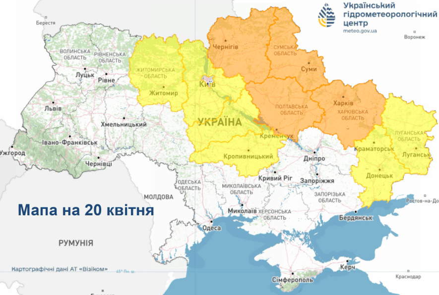 Ночью 20 апреля в северных, восточных и большинстве центральных областей на поверхности почвы ожидаются заморозки до -3 градусов мороза. На следующие сутки, 21 апреля, такая же ситуация будет наблюдаться в западных, центральных и Харьковской областях, а 22 апреля ночные заморозки на почве охватят почти всю страну, кроме юго-востока. Из-за этого в этих регионах объявлен первый (желтый) уровень опасности.