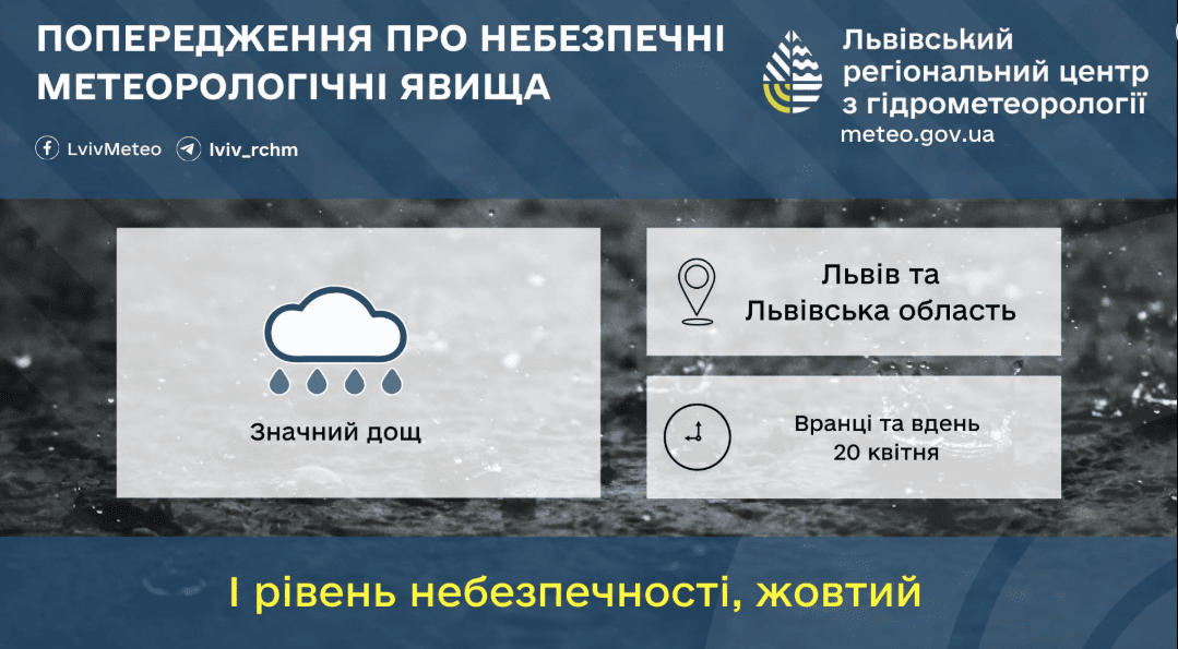 В то же время синоптики предупреждают о сильных дождях: по области и в городе Львове утром и днем местами пройдет значительный дождь. В регионе объявлен первый уровень опасности, желтый.