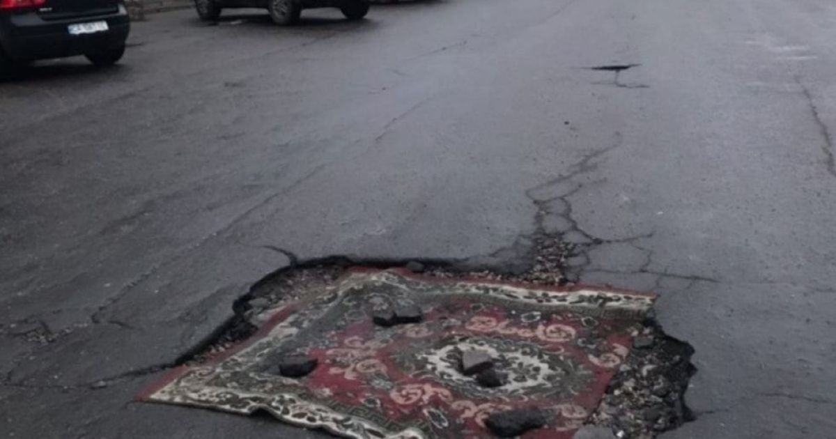 В Черкассах вблизи ТЦ "Гранд Маркет" на Мытнице, яму в асфальте решили "залатать" с помощью ковра. Так, им застелили выбоину на дороге, а чтобы ковер не унесло ветром — для надежности еще и "закрепили" его края кусками асфальта.