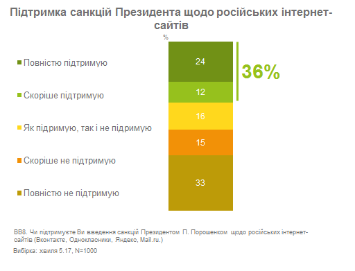 Почти половина опрошенных украинских интернет-пользователей (48%) не поддерживают решение президента Украины Петра Порошенко по блокированию российских интернет-сайтов.