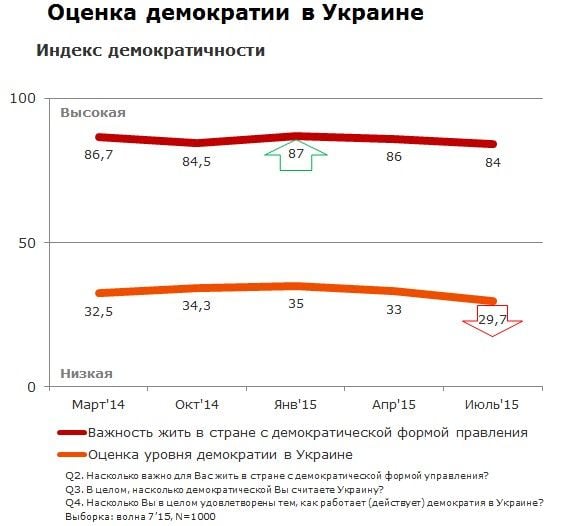 В то же время, опрос показал, что индекс оценки демократичности Украины падает и в июле достиг своего минимума за последний год.
