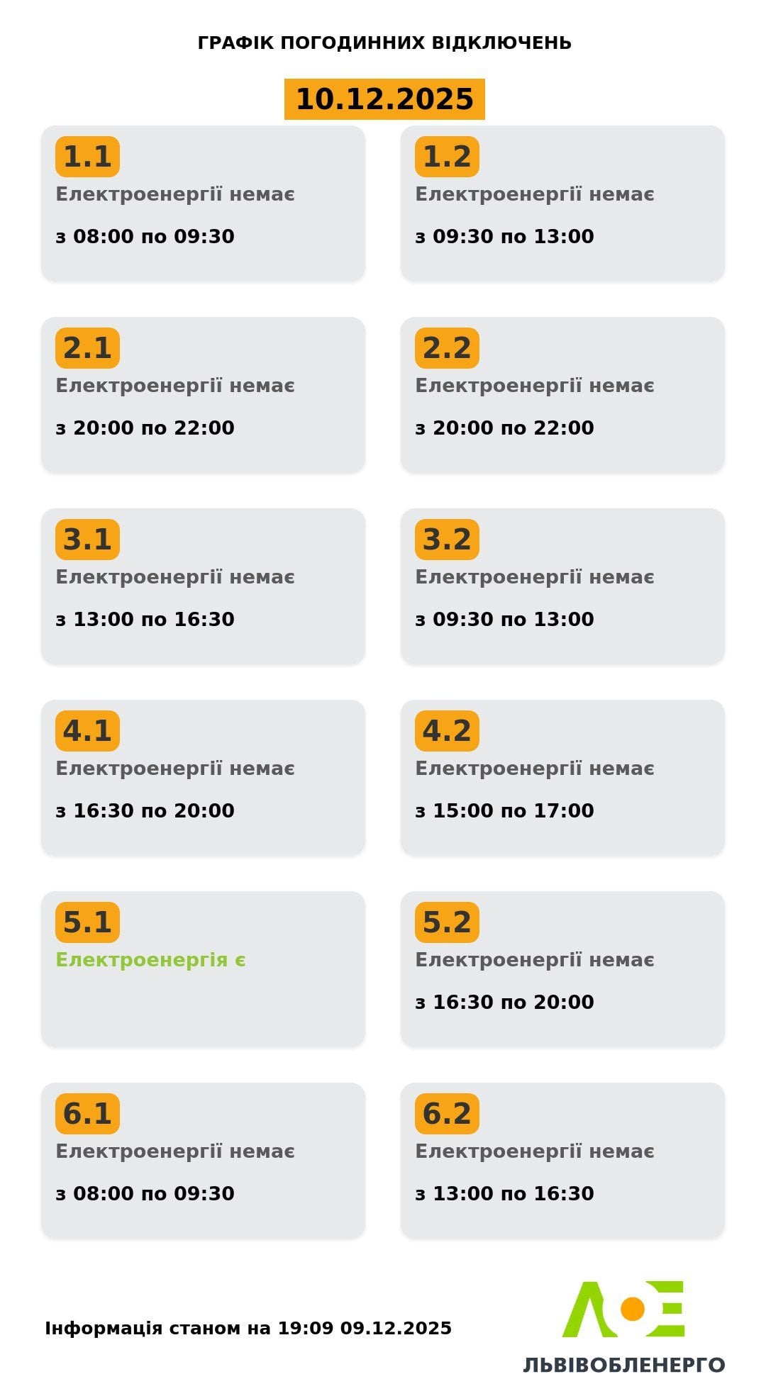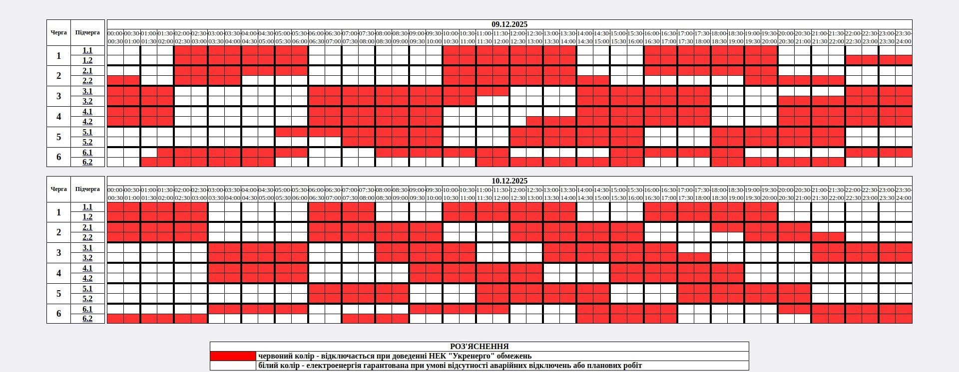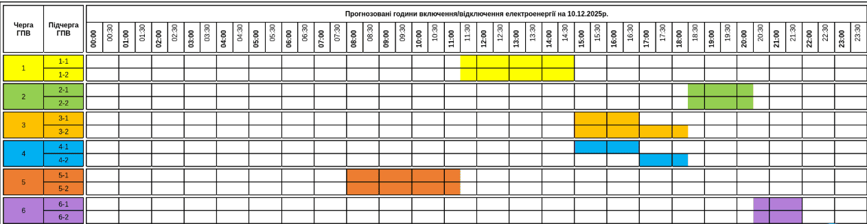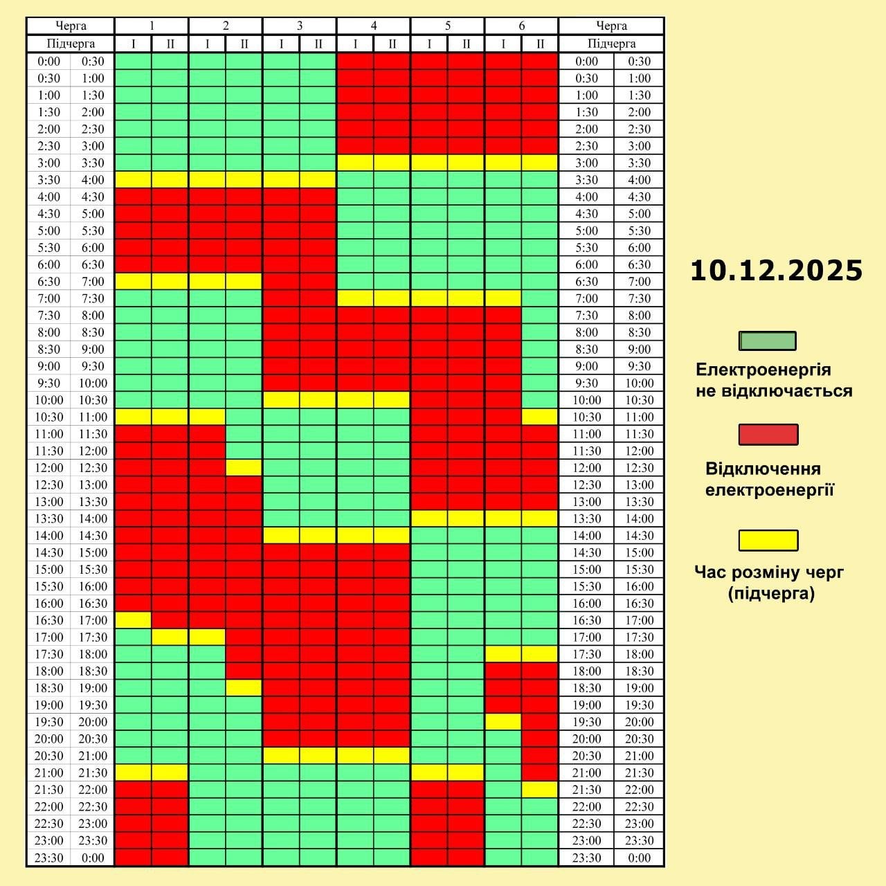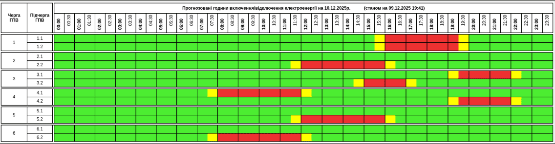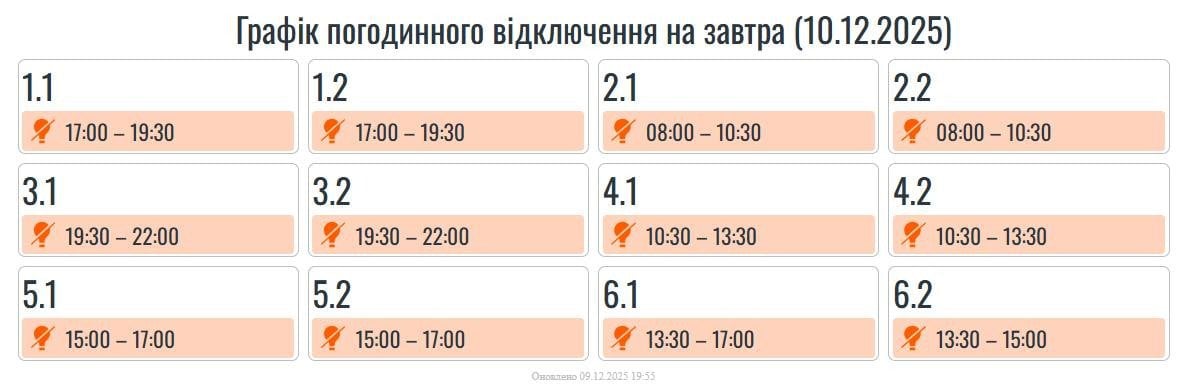 Во всех регионах Украины в среду, 10 декабря, будут действовать графики почасовых отключений света. Причина введения ограничений — последствия предыдущих российских массированных ракетно-дроновых атак на энергообъекты.