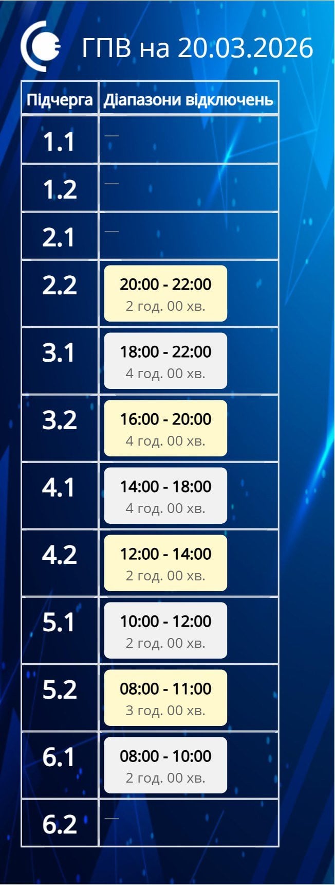 Отключение света 20 марта: актуальные графики для всех областей