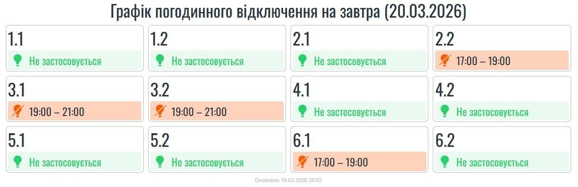 Во всех регионах Украины в пятницу, 20 марта, будут введены графики почасовых отключений света . Причина ограничений электроснабжения – последствия российских массированных ракетно-дроновых атак на энергообъекты.