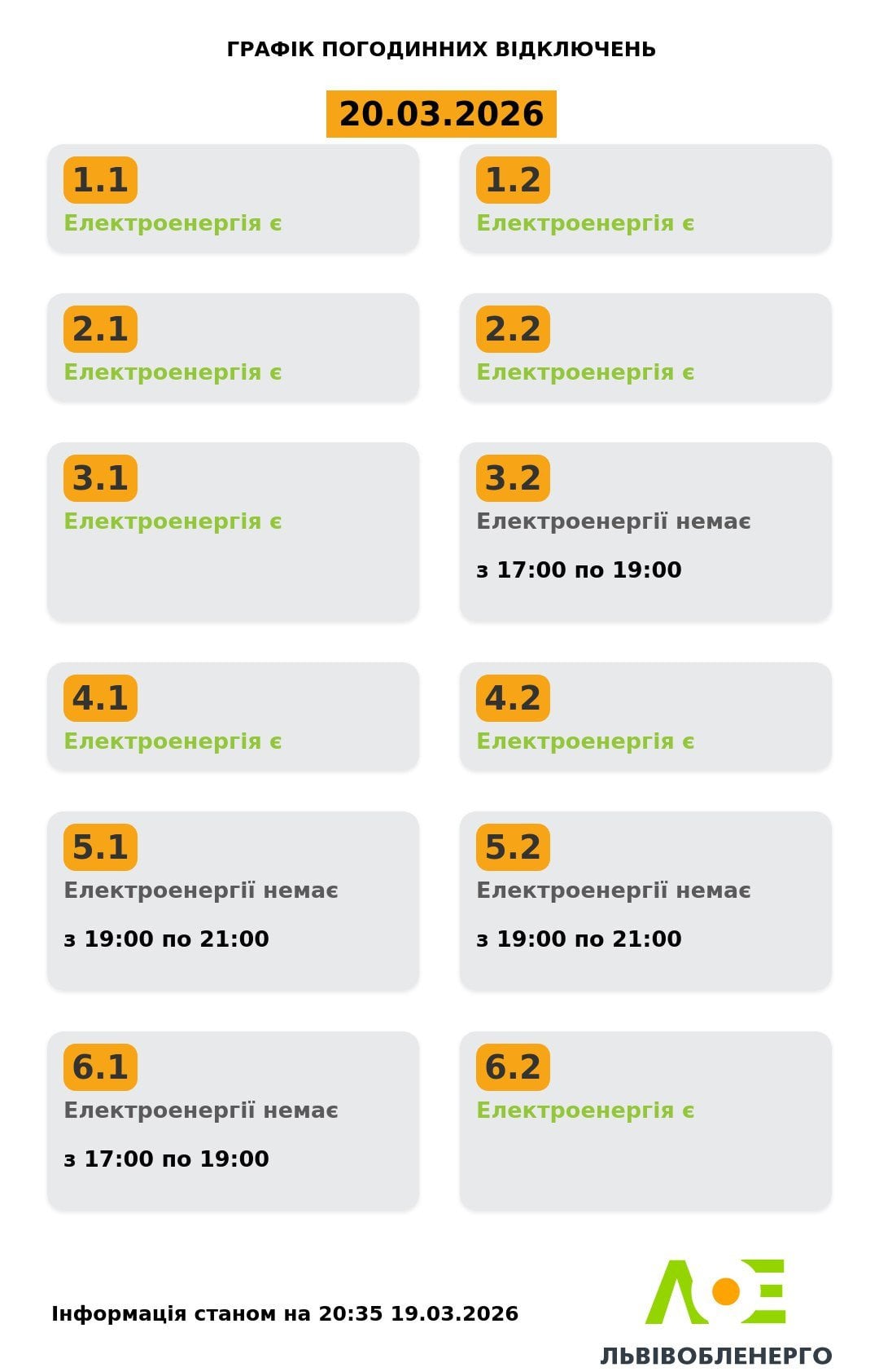 График отключения света на Львовщине 20 марта