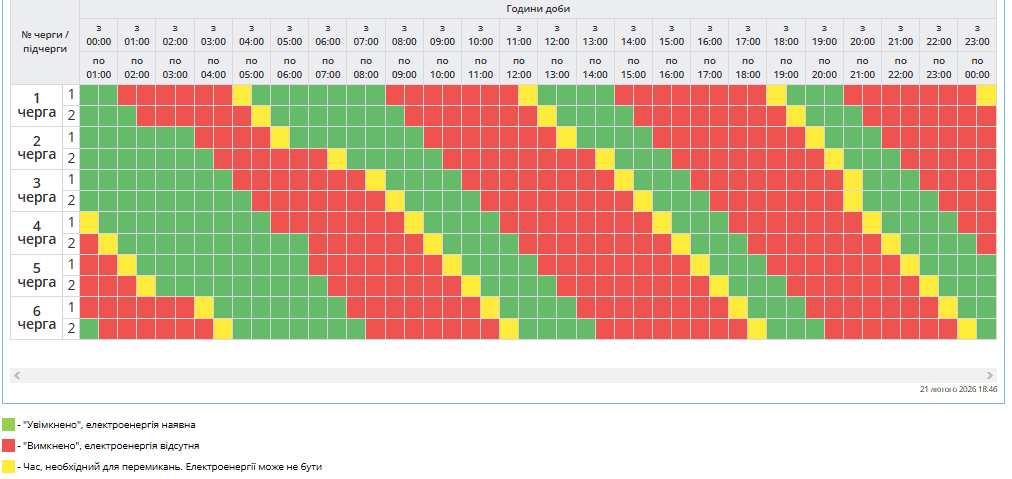 Во всех регионах Украины в воскресенье, 22 февраля, будут введены графики почасовых отключений света . Причина ограничений электроснабжения – последствия российских массированных ракетно-дроновых атак на энергообъекты.