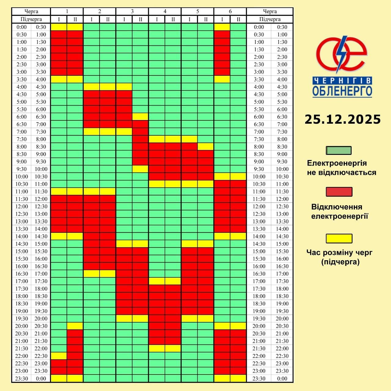 На Закарпатті 25 грудня графік буде одним із найкомфортніших по країні: світло вимикатимуть лише один раз на добу. Тривалість цього єдиного відключення складає переважно 4 години (для черг 1, 2, 3), а деякі групи (4 та 5.1) матимуть ще коротші обмеження — по 1,5–2 години, тож сумарно електроенергія буде наявна понад 20 годин.