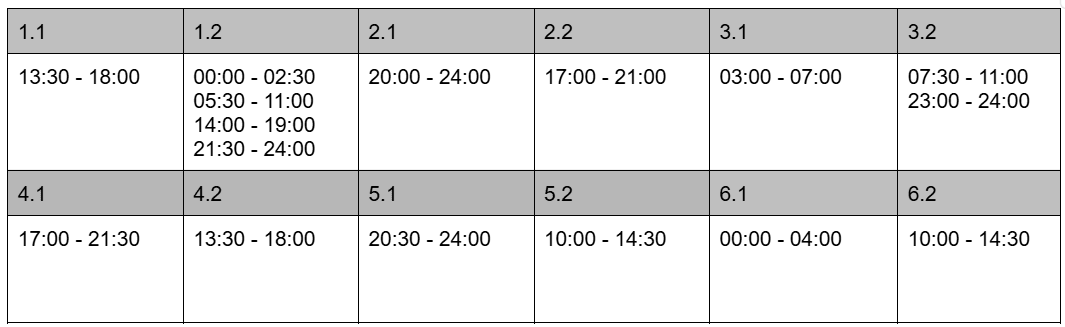 1.1 - 00:00 - 04:30; 08:30 - 12:30; 15:30 - 21:30;