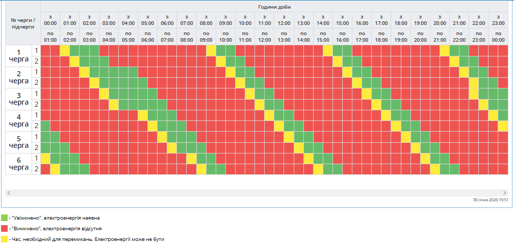Во всех регионах Украины в субботу, 31 января, будут введены графики почасовых отключений света . Причина ограничений электроснабжения – последствия российских массированных ракетно-дроновых атак на энергообъекты.