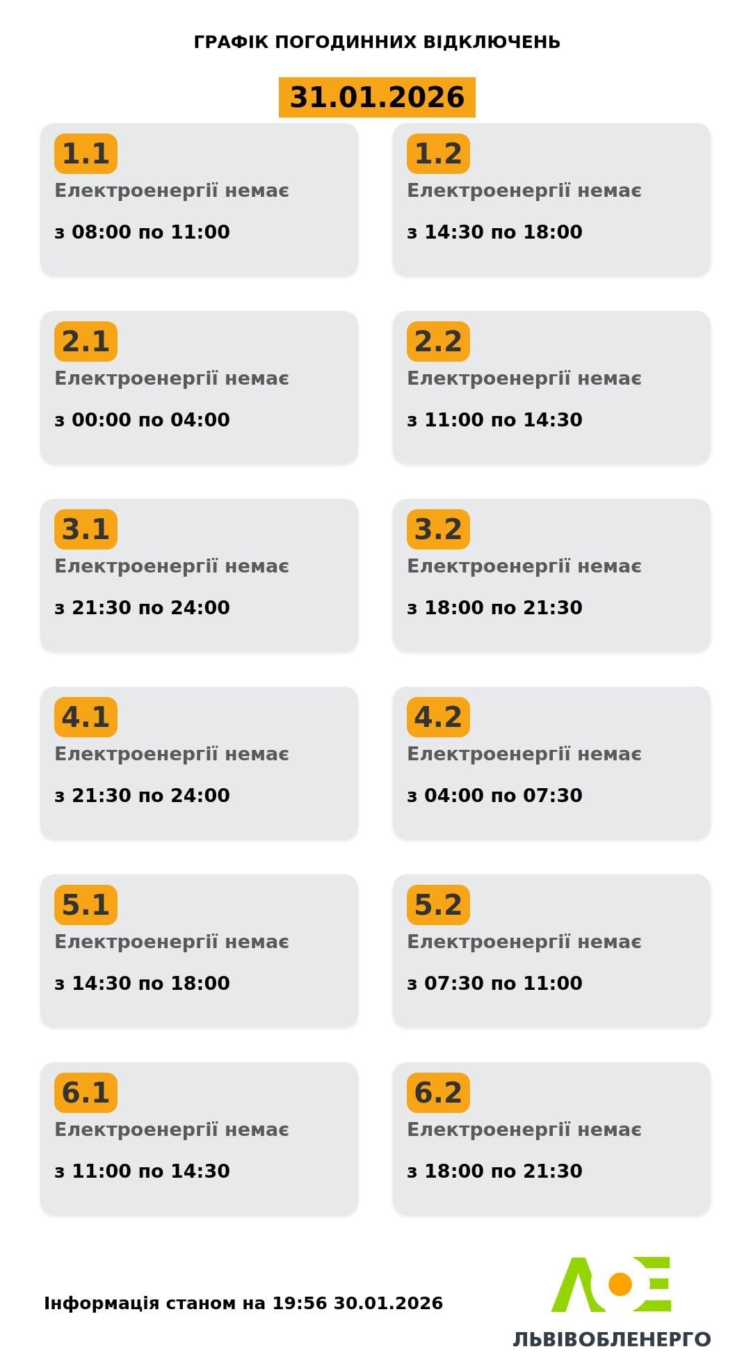 График отключения света на Львовщине 31 января