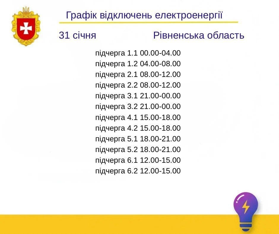 График отключения света на Ровенщине 31 января