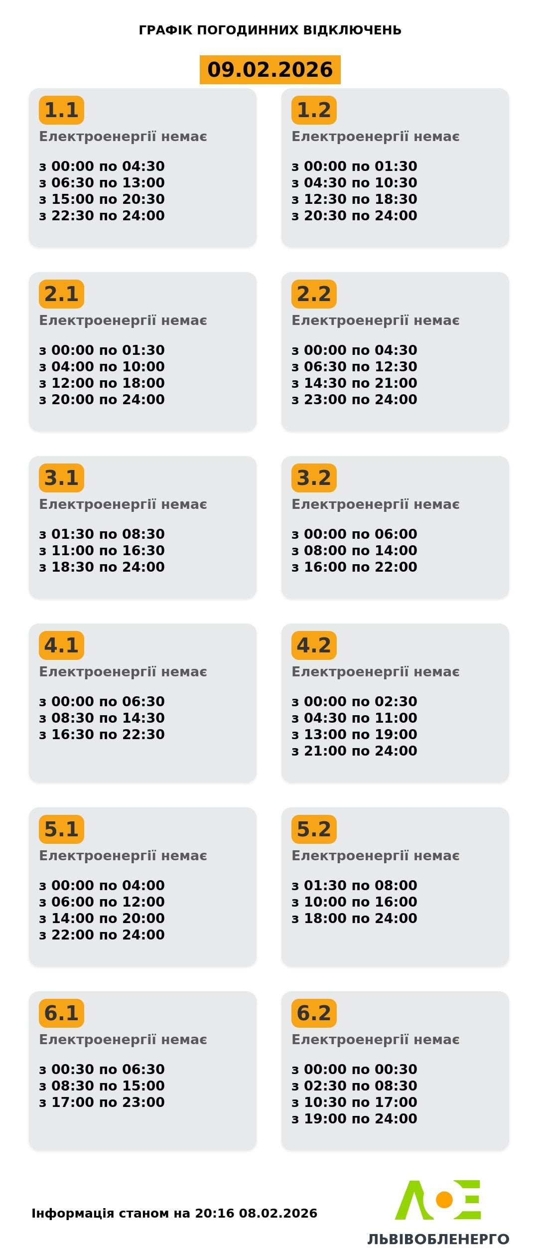 Как сообщилив «Львовоблэнерго», график по подгруппам будет таким: