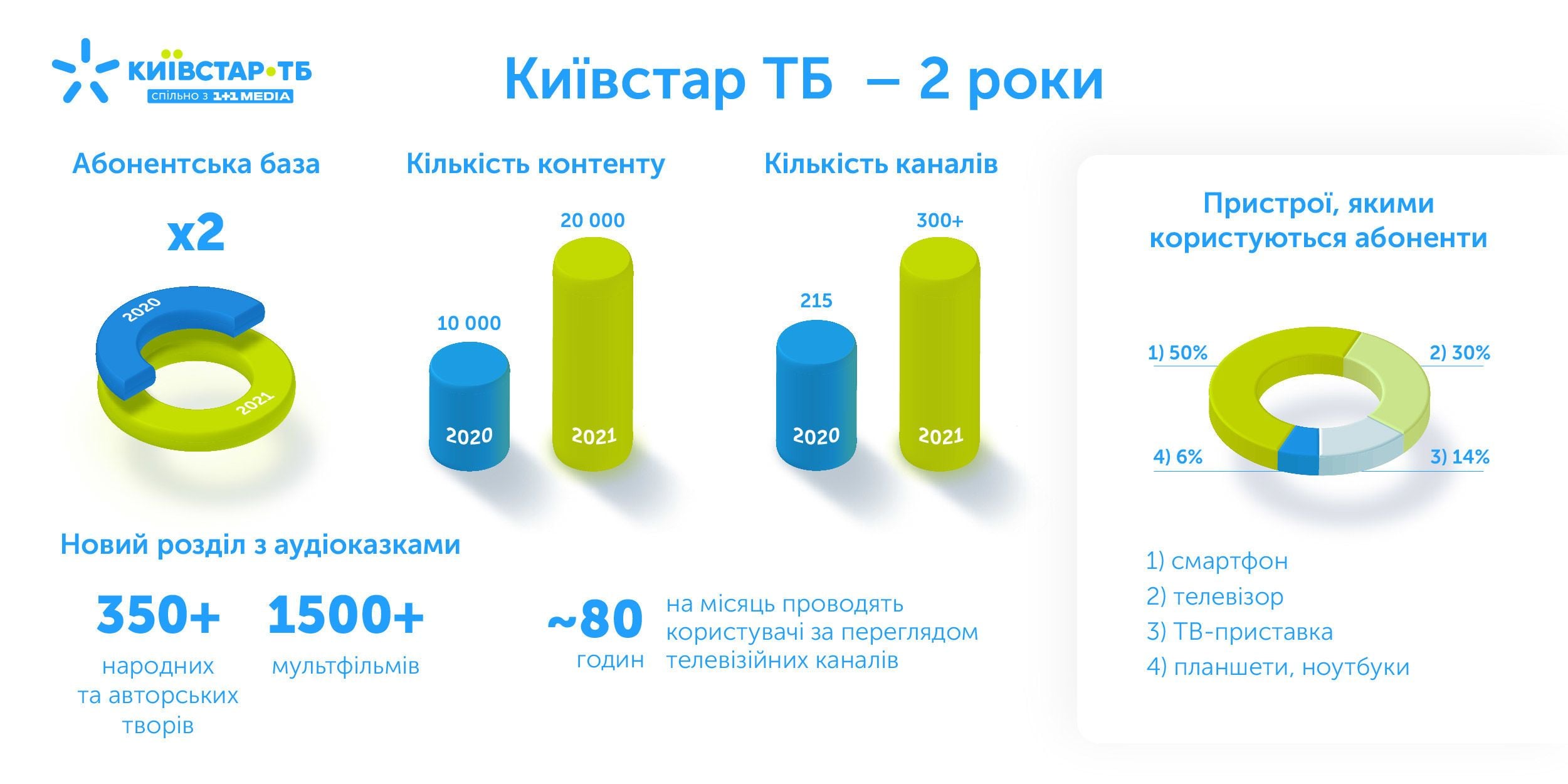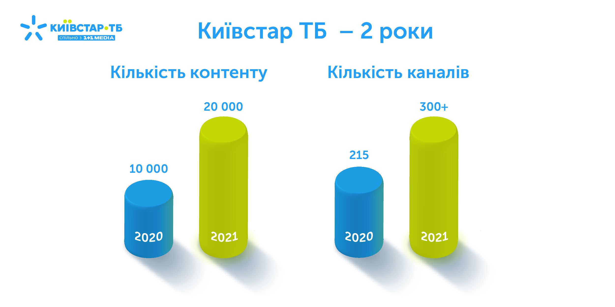 11 декабря платформа онлайн-телевидения Киевстар ТВ отмечает два года с момента запуска. В 2021 году на платформе произошло увеличение количества абонентов и объема библиотеки, трансляция эксклюзивов, допремьерных показов, расширение детского контента и вовлечение в развитие киноиндустрии.