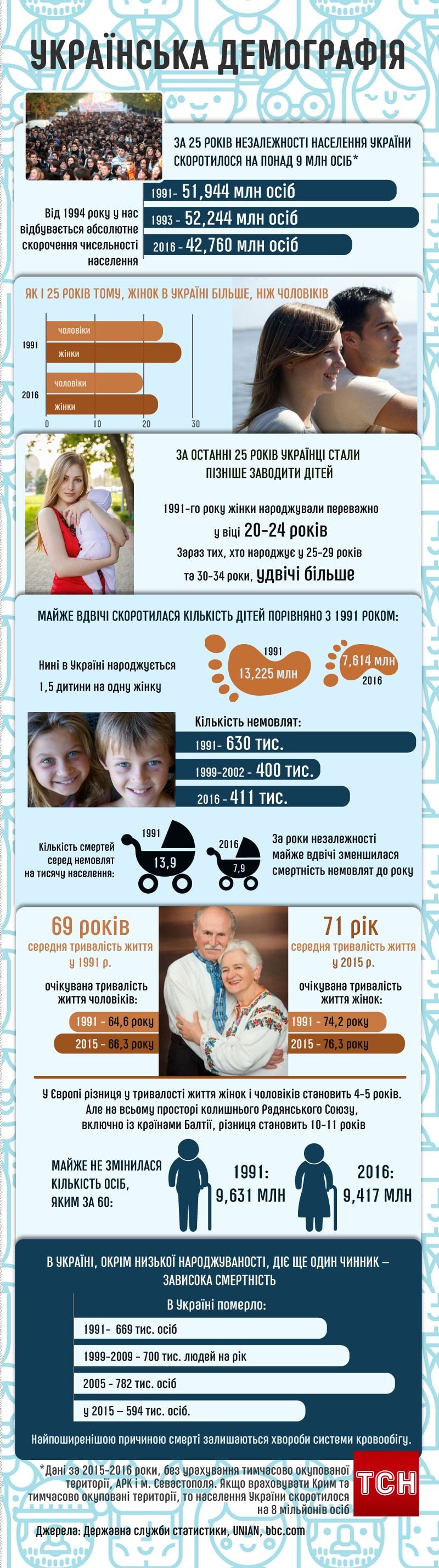 Новации в виде пакета малыша, муниципальной няни и т. п. не привели к всплеску рождаемости. За годы независимости украинцев стало на 10 миллионов меньше – 42 миллиона. Такая потеря сопоставима с количеством населения таких стран, как Греция, Швеция или Португалия. По неофициальной же информации, еще несколько миллионов людей работают за границей, поэтому в Украине постоянно проживает около 35 млн реального населения.