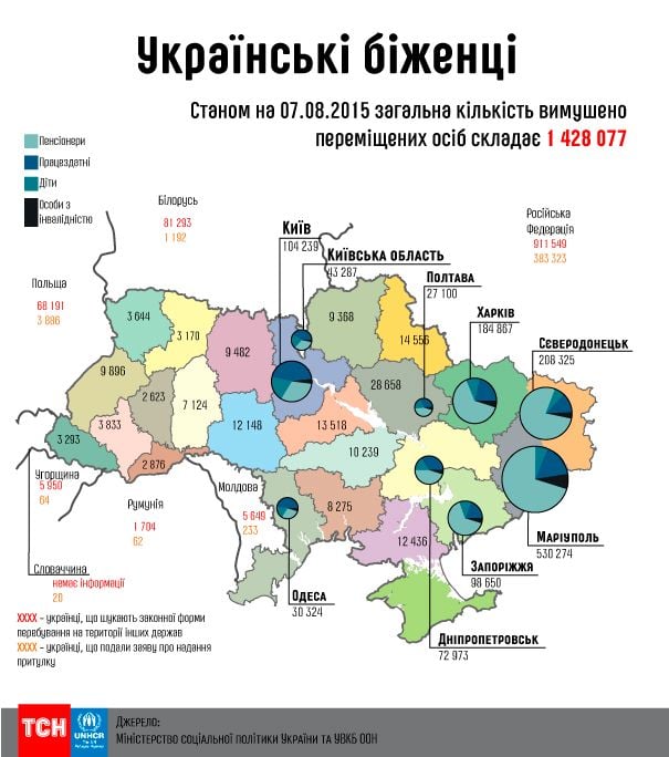 По состоянию на 7 августа 2015 года общее количество вынужденных переселенцев из Донбасса составляет 1 428 077 человек.