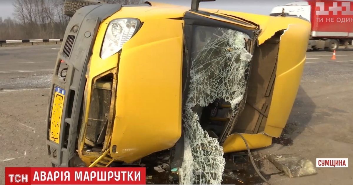 В Сумской области произошла авария с участием микроавтобуса и грузового авто. От мощного удара маршрутка с восемью пассажирами перевернулась, говорится в сюжете ТСН.19:30.