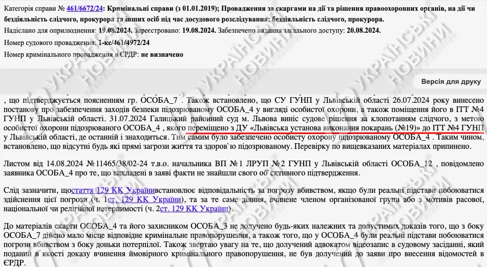 Отмечается, что 31 июля Галицкий районный суд Львова вынес судебное решение по ходатайству следователя, с целью личной охраны подозреваемого, которого переместили из ГУ "Львовское учреждение исполнения наказаний (№19)" в ИВС №4 ГУНП во Львовской области. Там подозреваемый сейчас и находится.