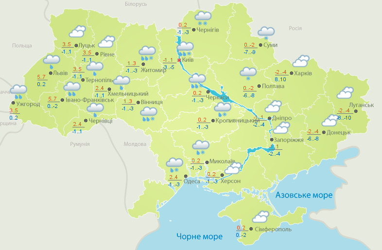 Днем в Украине обещают от 2 градусов мороза до 3 градусов тепла. на в восточных, Сумской и Полтавской областях столбики на термометра покажут 1-6 градусов выше нуля. На западе страны обещают 2-7 градусов мороза.