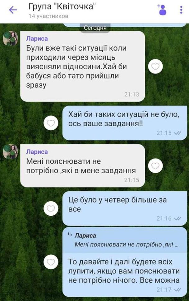 О том, что ребенка ударили в Вепринском детском саду в соцсети рассказала его мама Маша Ткачук и добавила скрины переписки с заведующей учреждения и воспитателями в группе в Вайбер. Женщина предупредила персонал учреждения, если подобная ситуация повторится, она будет обращаться дальше. Заведующая в свою очередь обвинила маму в том, что та поздно начала разбираться в ситуации, а воспитательница группы отправила в адрес женщины ругательное сообщение.