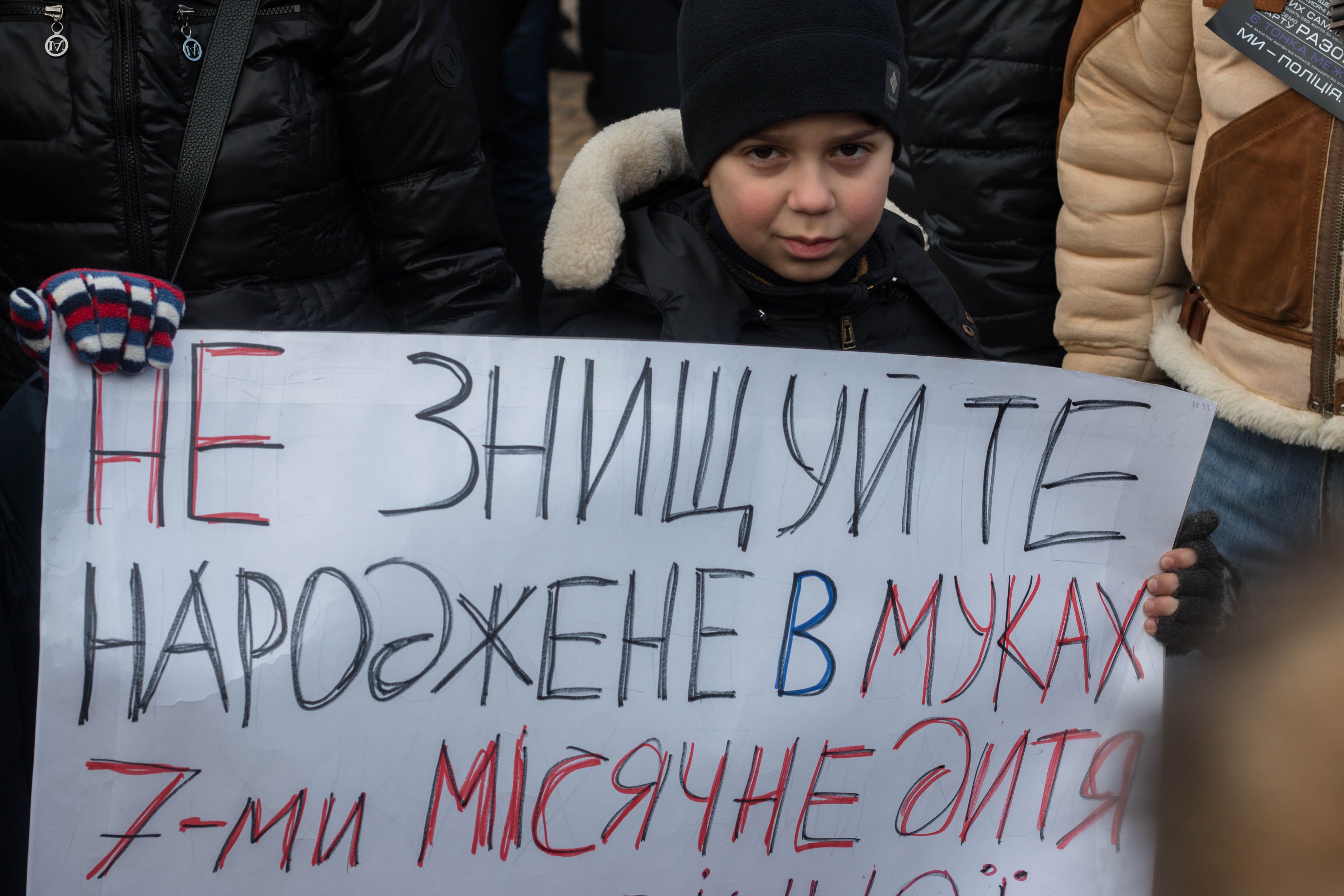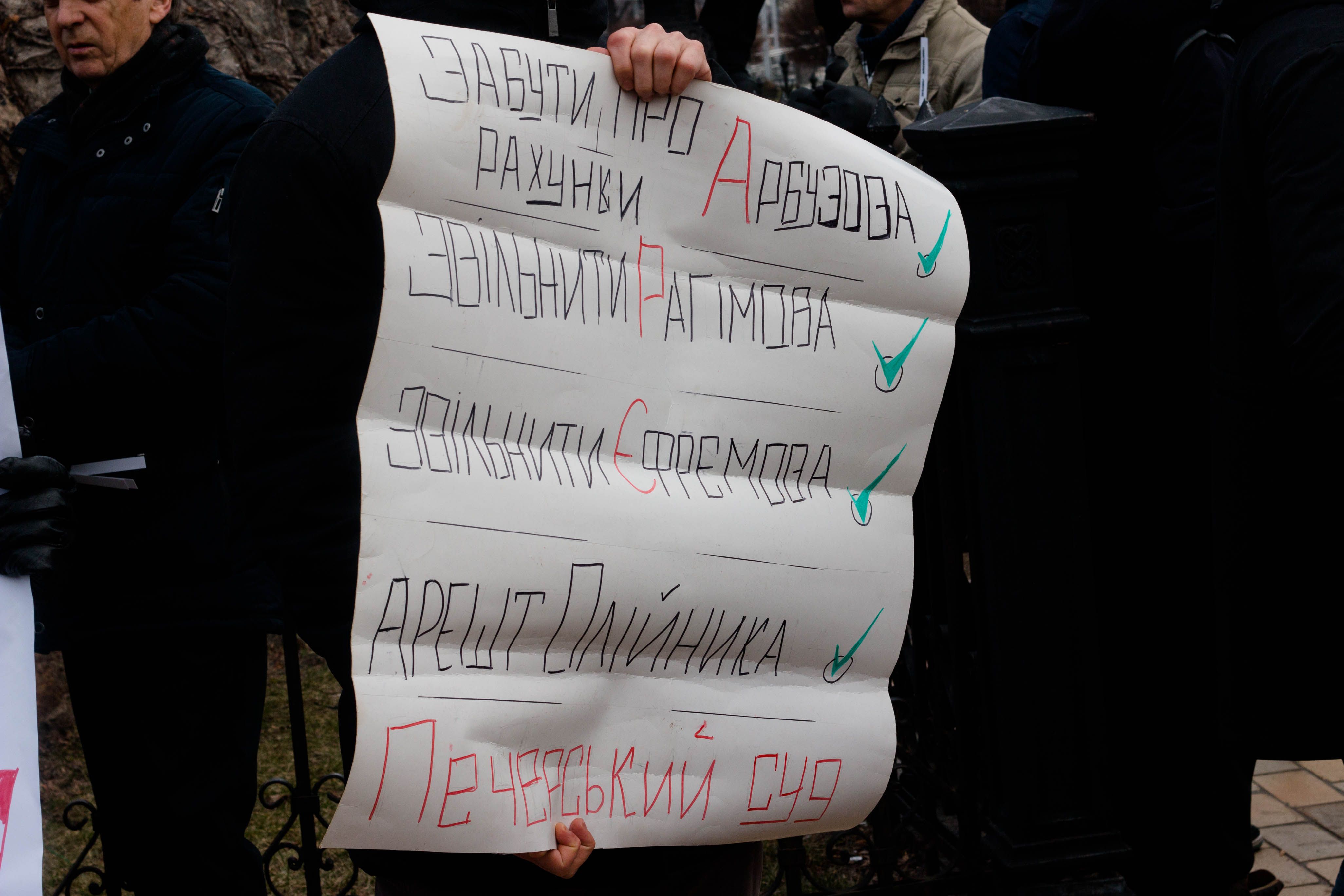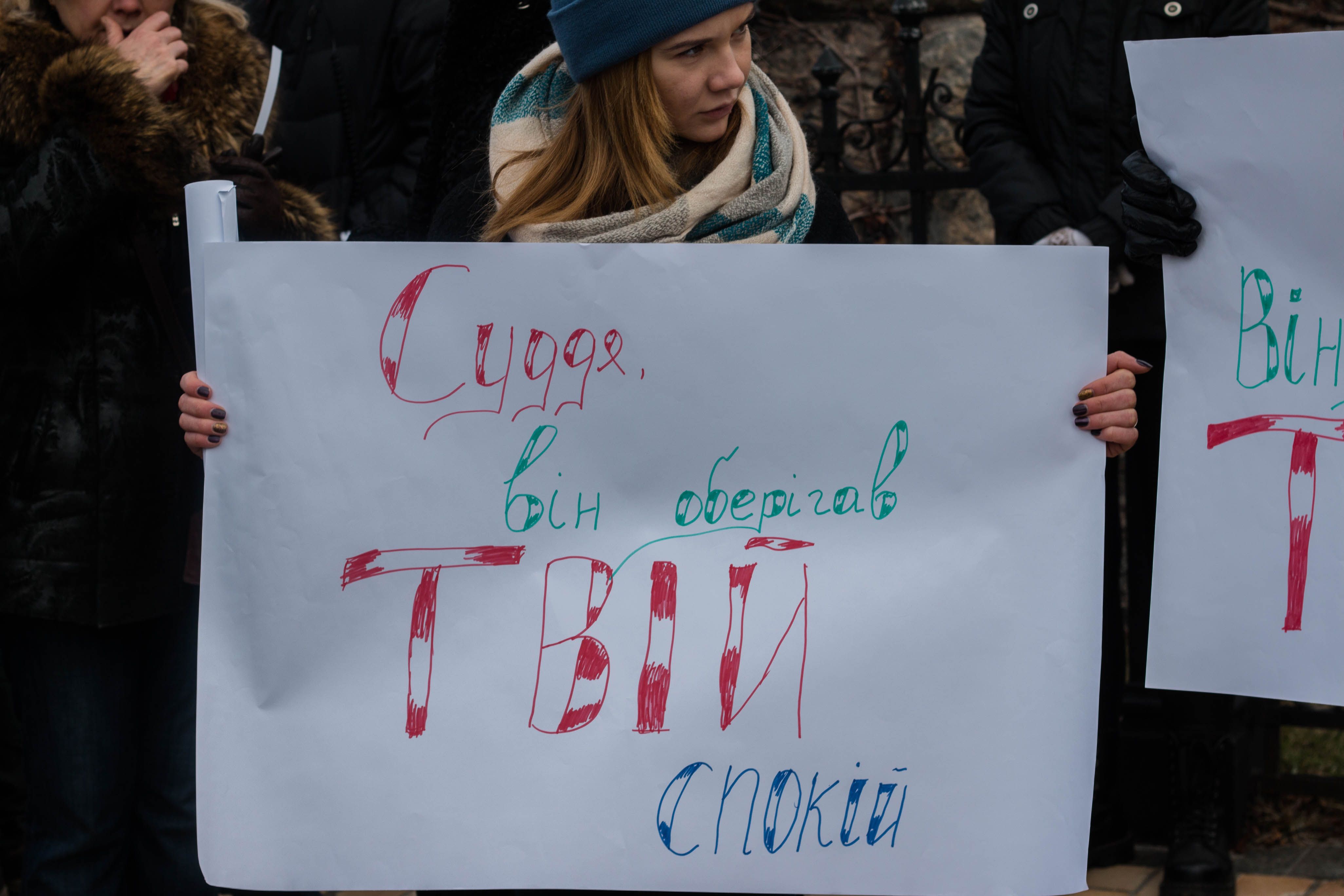 Часть из присутствующих пришли поддержать Сергея Олейника, арестованного на два месяца патрульного, который подозревается в убийстве 17-летнего подростка во время преследования автомобиля BMW в ночь на 7 февраля в Киеве.