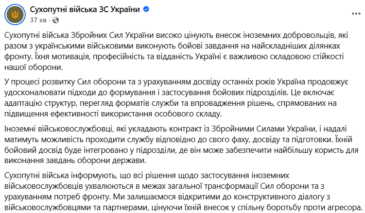 В Сухопутных войсках заверили, что высоко ценят вклад иностранных добровольцев, которые вместе с украинскими военными выполняют боевые задачи на сложных участках фронта. Наявные изменения там объяснили необходимостью «совершенствовать подходы к формированию и применению боевых подразделений».