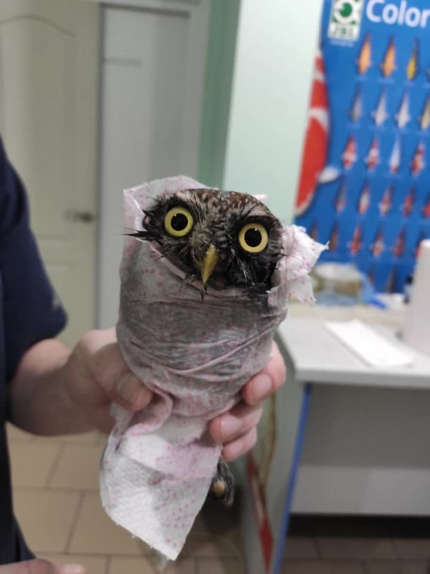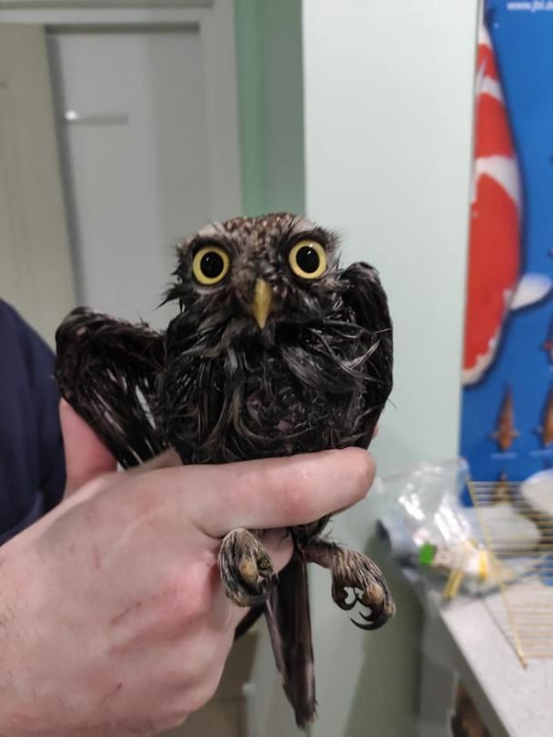 Сейчас сыча выхаживают ветврачи. Птицу немного отмыли, и она проходит терапевтические процедуры против интоксикации.
