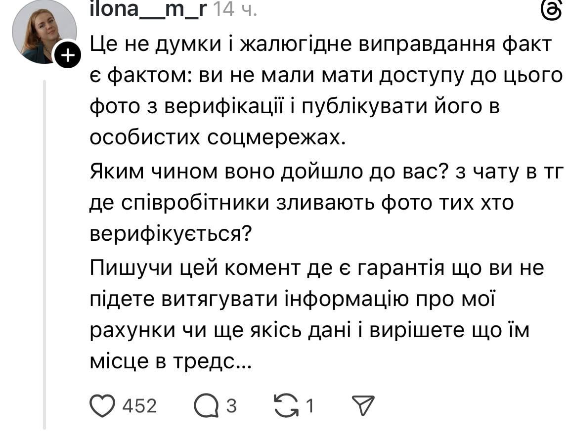 Клиенткой, оказавшейся в центре скандала, является Карина Кольб. На своей странице у Threads она опубликовала опровержение обвинений в пророссийских взглядах. Девушка объяснила, что проходила верификацию не дома и не обратила внимания на фон.