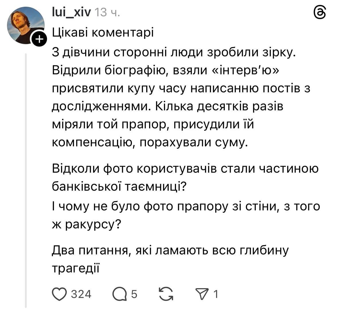«То, что мой ребенок пишет на русском, мы не виноваты, что у нас преподавали на русском. Я поражена, что мой ребенок пострадал из-за руководителя банка, что он опубликовал фото и написал, что заблокировали „из-за немытой головы“. Что касается флага РФ, то у меня два дня была истерика, потому что мы патриоты Украины. Мой муж служит, получил ранение. Хотя еще в начале войны мог уехать как многодетный отец. А здесь этот банкир просто отвратил нашу семью», — заявила женщина.