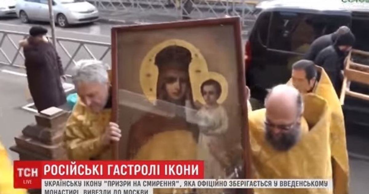 Украинскую икону "Призри на смирение" вывезли в Москву. Образ, который в 93-м отпечатался на стекле, с того времени признали чудотворным. Икона стала реликвией Украинской церкви и официально хранится в Веденском монастыре в Киеве. Но несмотря на необъявленную войну с Россией, образ Божией матери Православная церковь Московского патриархата отправила на гастроли. Об этом говорится в сюжете ТСН.19.30.