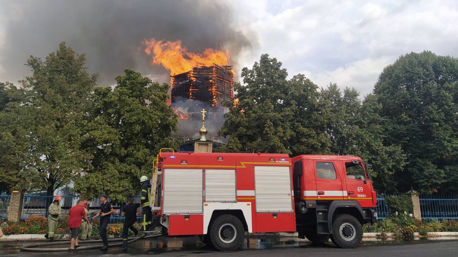 К спасателям информация о пожаре в храме на ул. Петропавловская поступила в 13:58. Прибыв на место, пожарные сразу приступили к тушению пожара. Но из-за плотного задымления и материала, из которого построена церковь (дерево — ред.), был объявлен повышенный номер вызова №2.