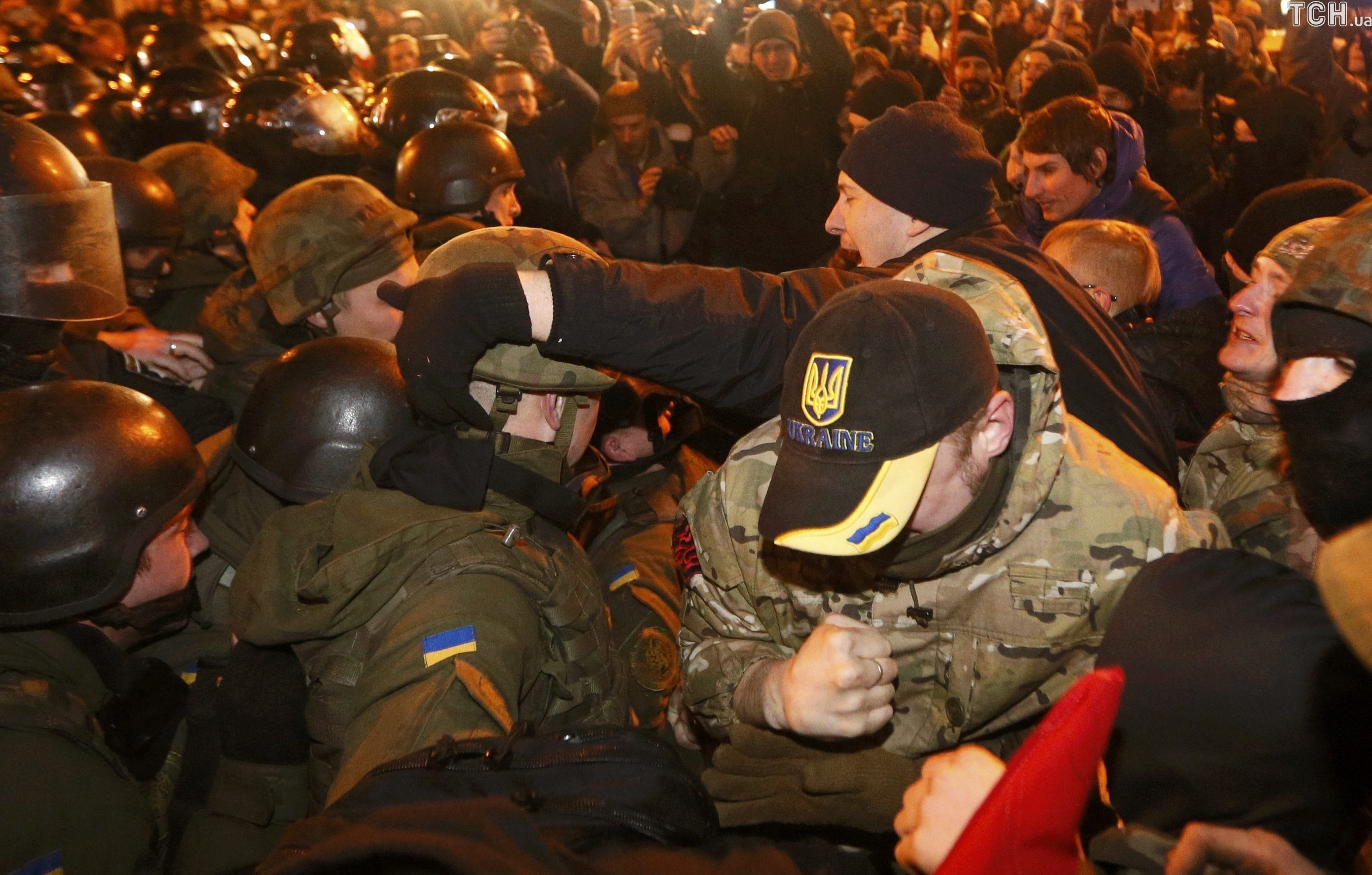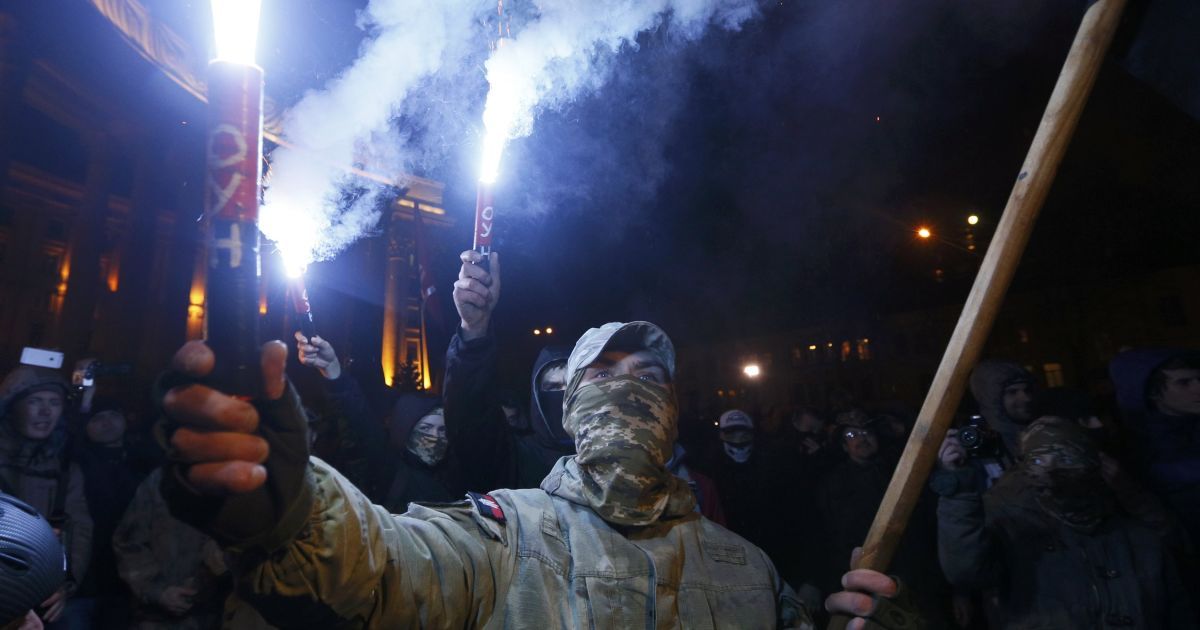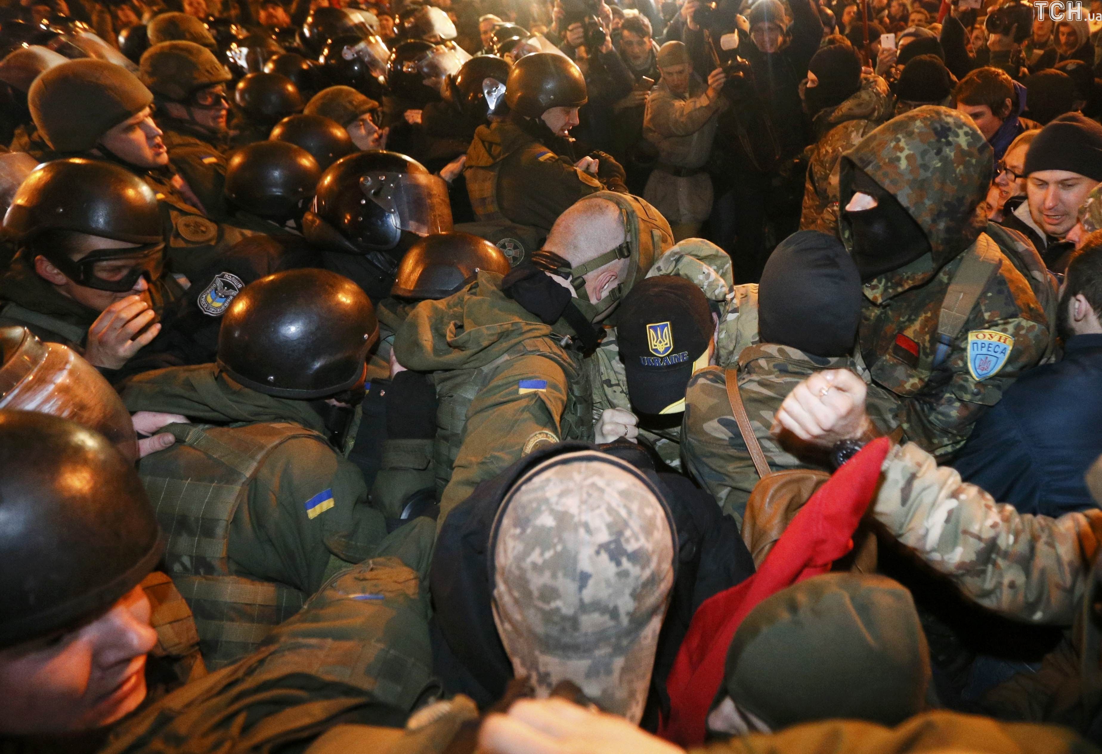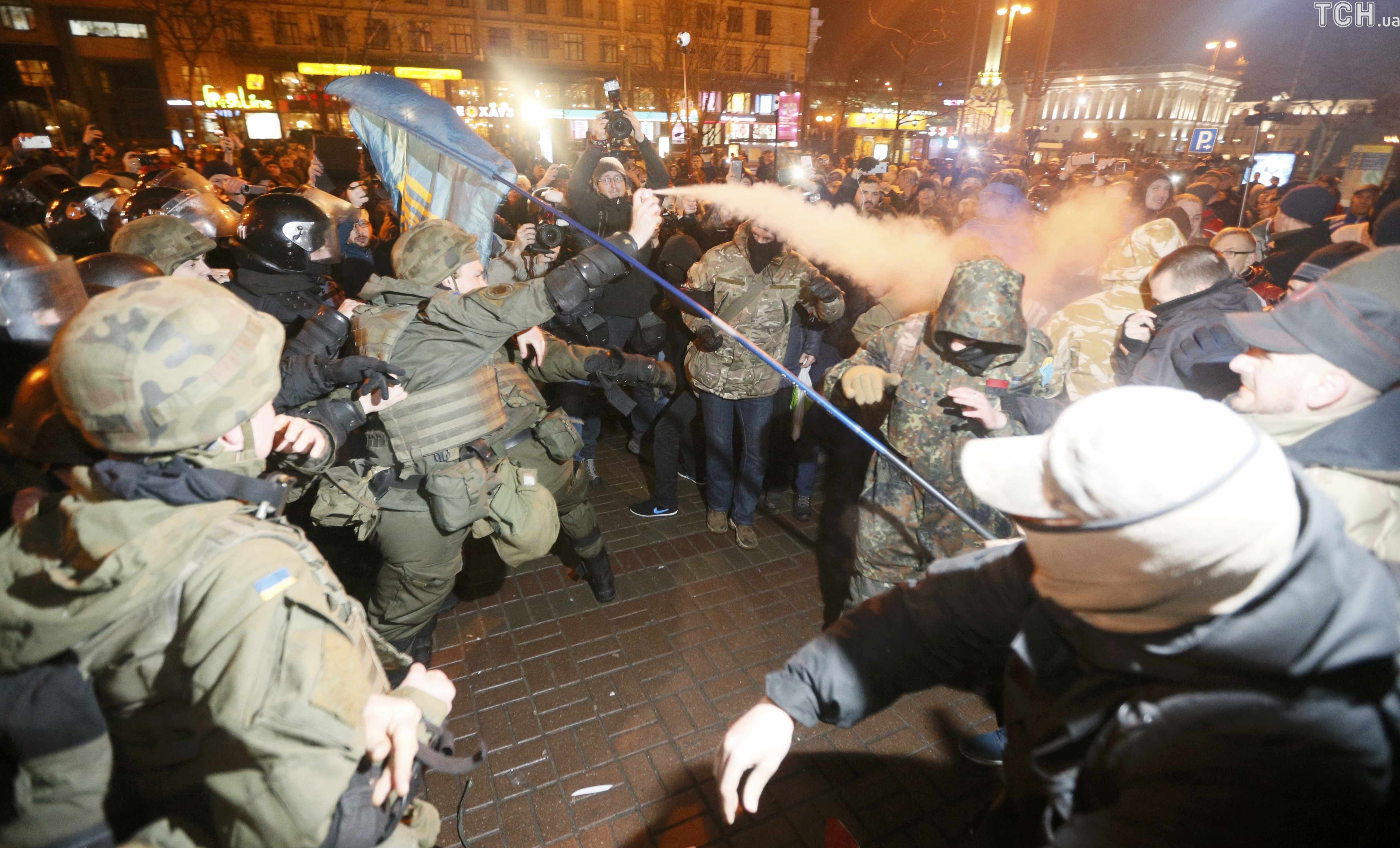 После выступлений лидеров праворадикальных движений группа протестующих из движения "ОУН" во главе с их лидером Николаем Коханивским отправились к Михайловской площади, где пытались забросать камнями и петрадами офис олигарха Рината Ахметова, но наткнулись на кордон правоохранителей.