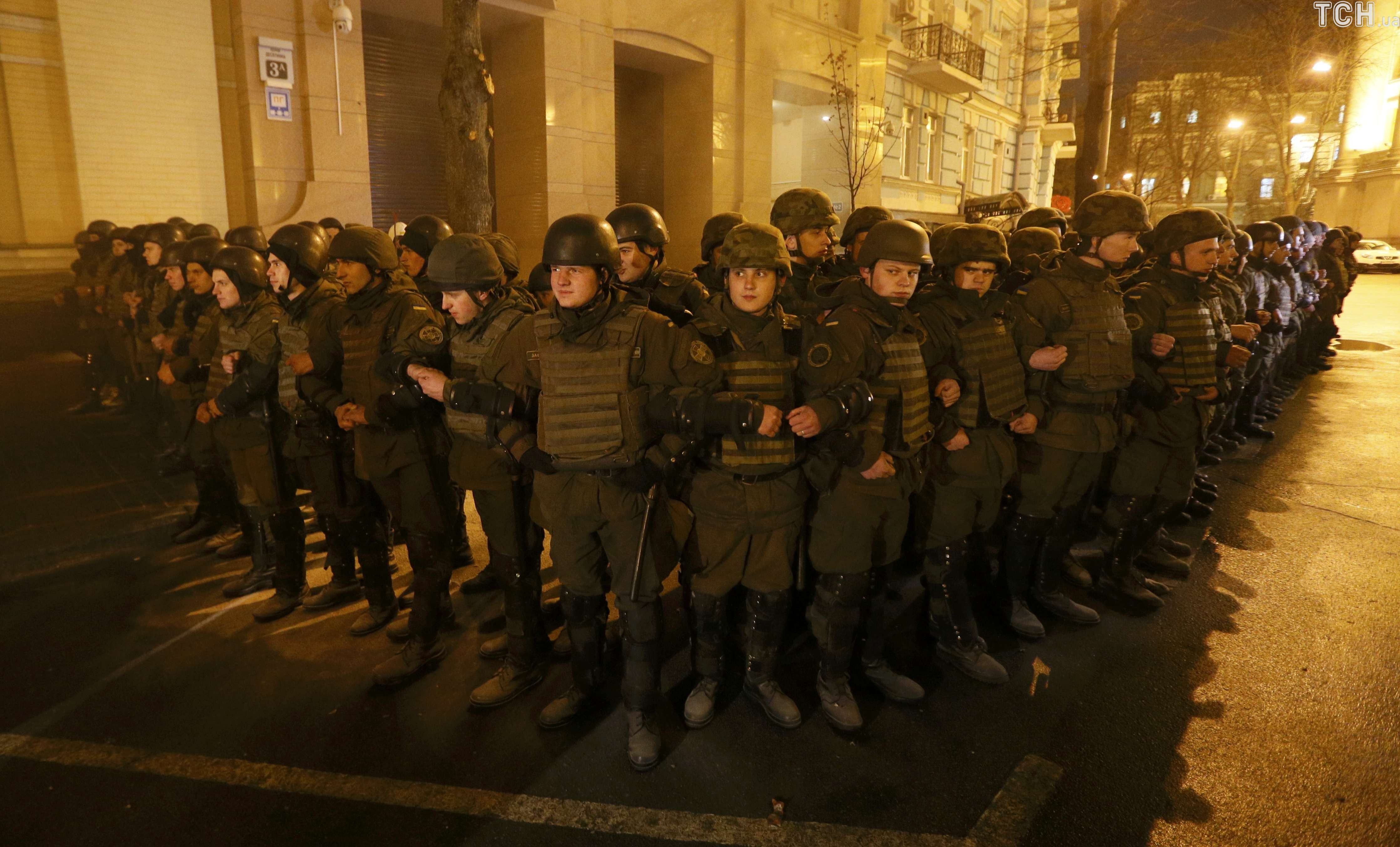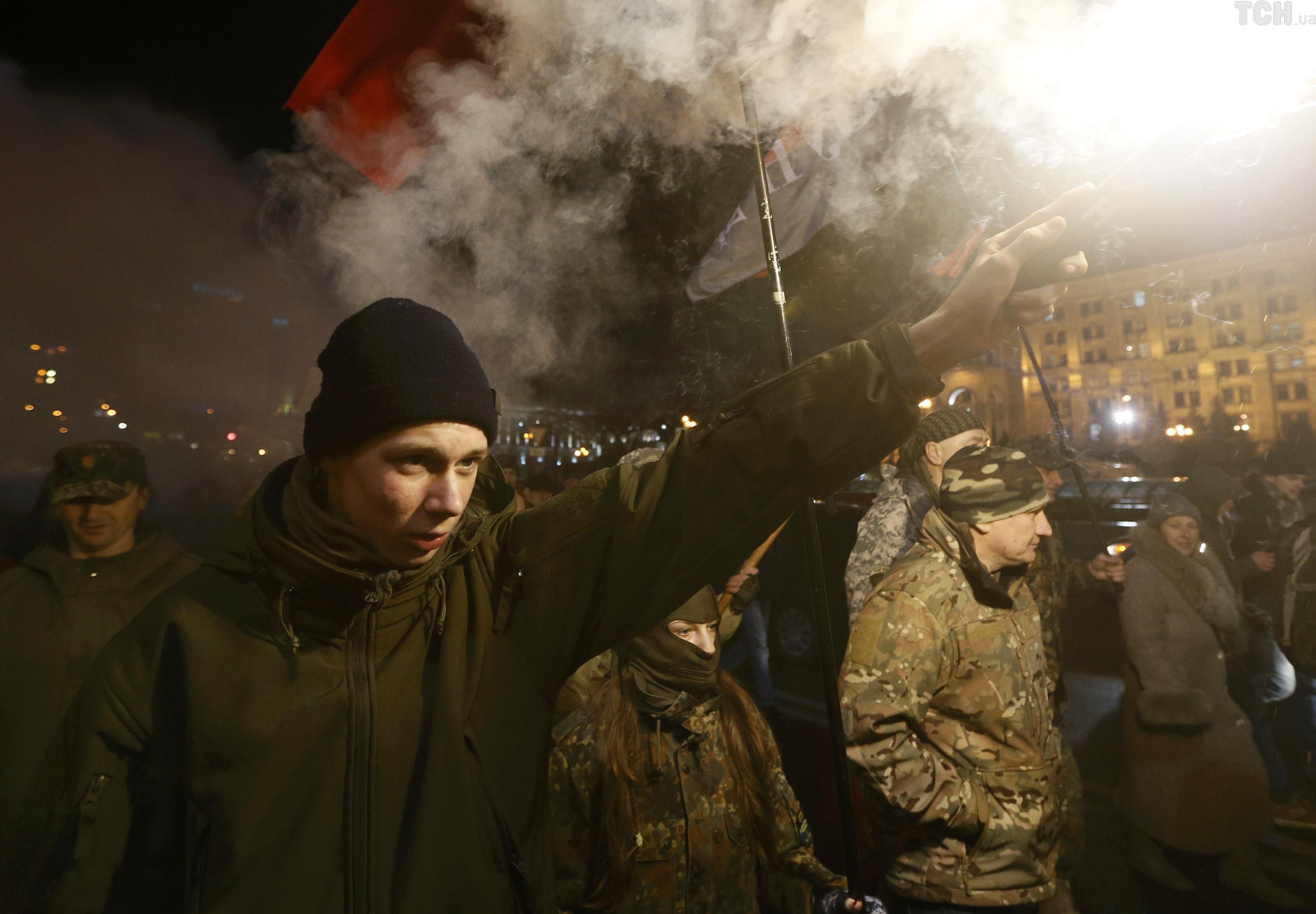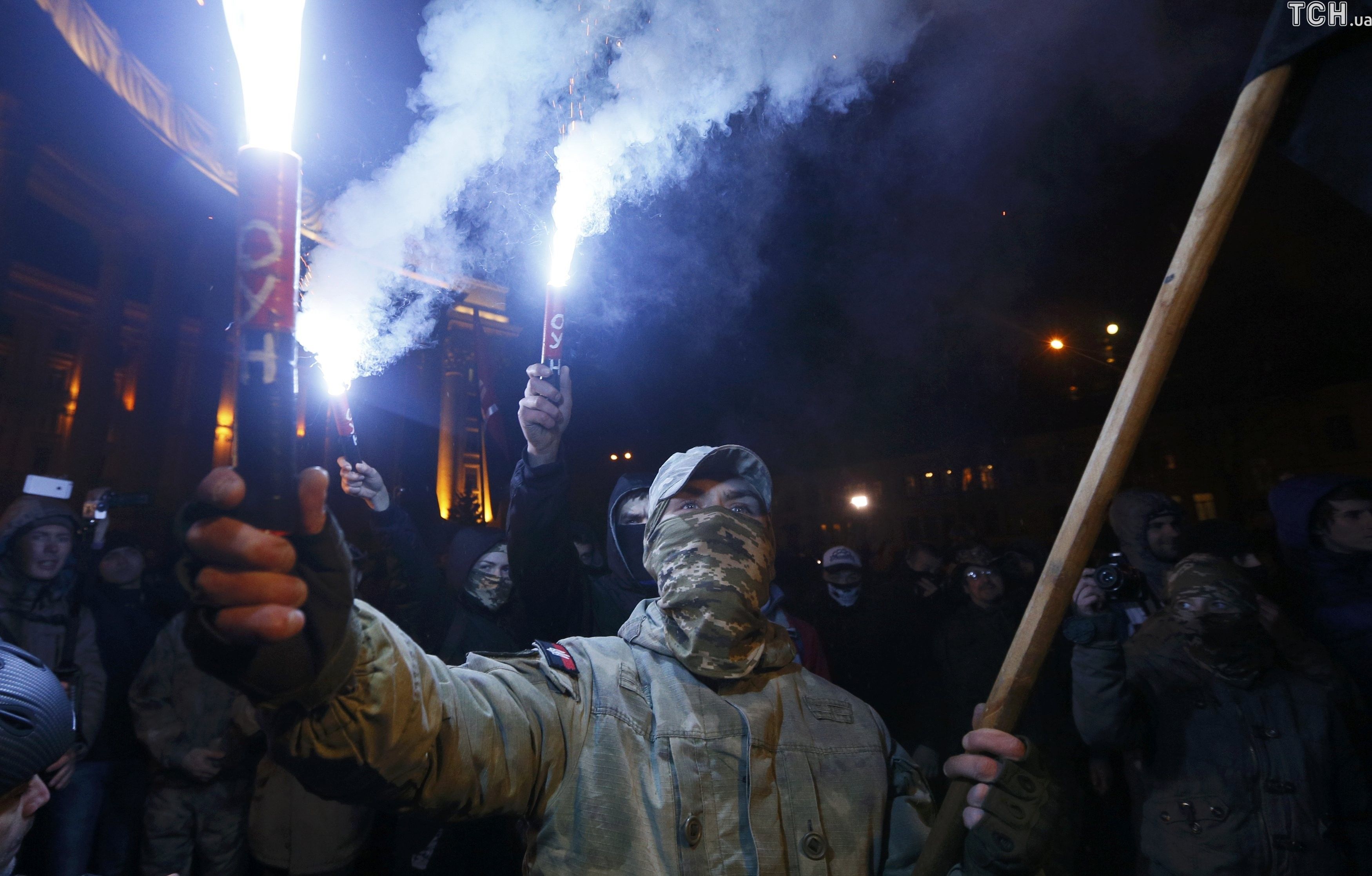 После выступлений лидеров праворадикальных движений группа протестующих из движения "ОУН" во главе с их лидером Николаем Коханивским отправились к Михайловской площади, где пытались забросать камнями и петрадами офис олигарха Рината Ахметова, но наткнулись на кордон правоохранителей.