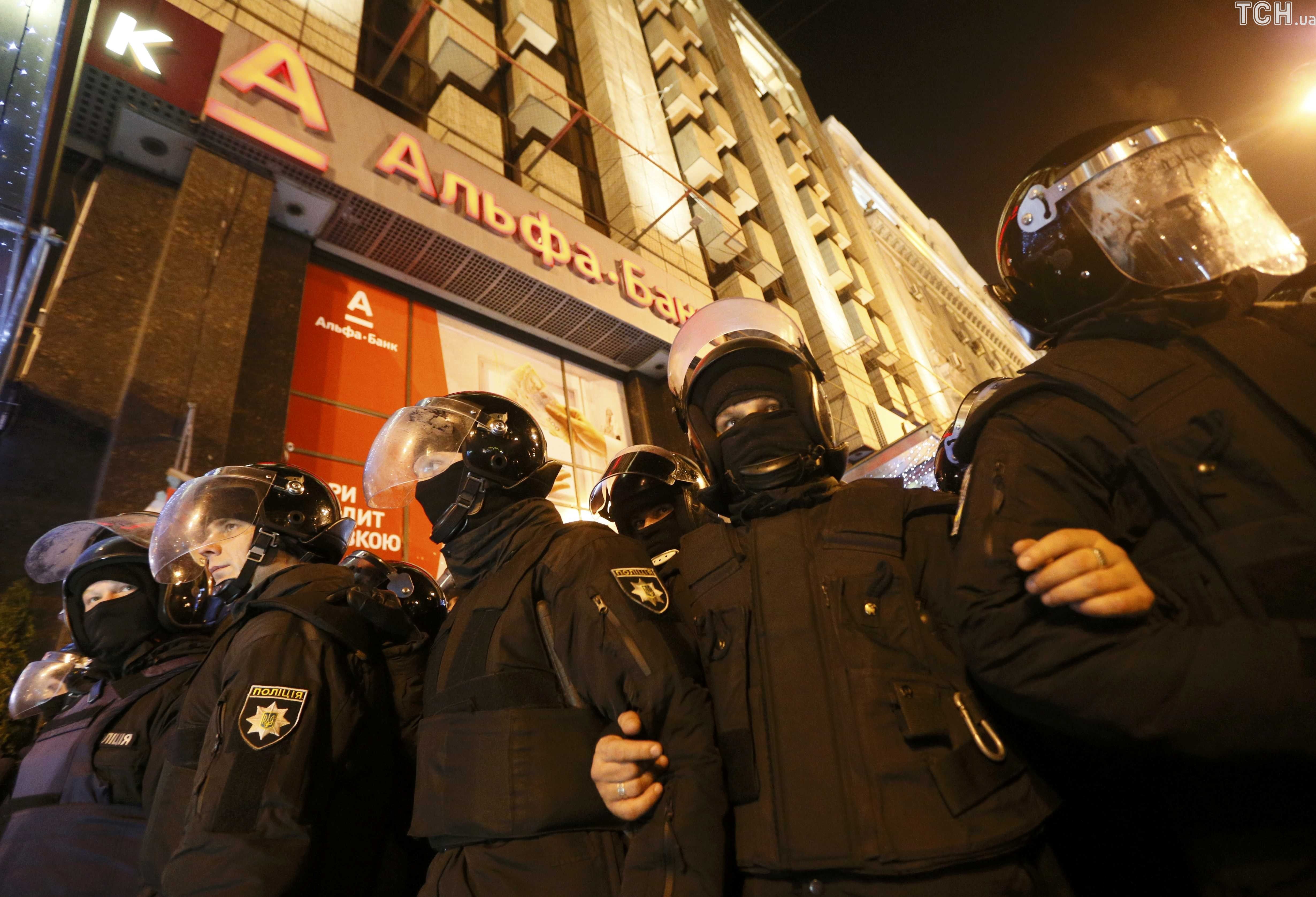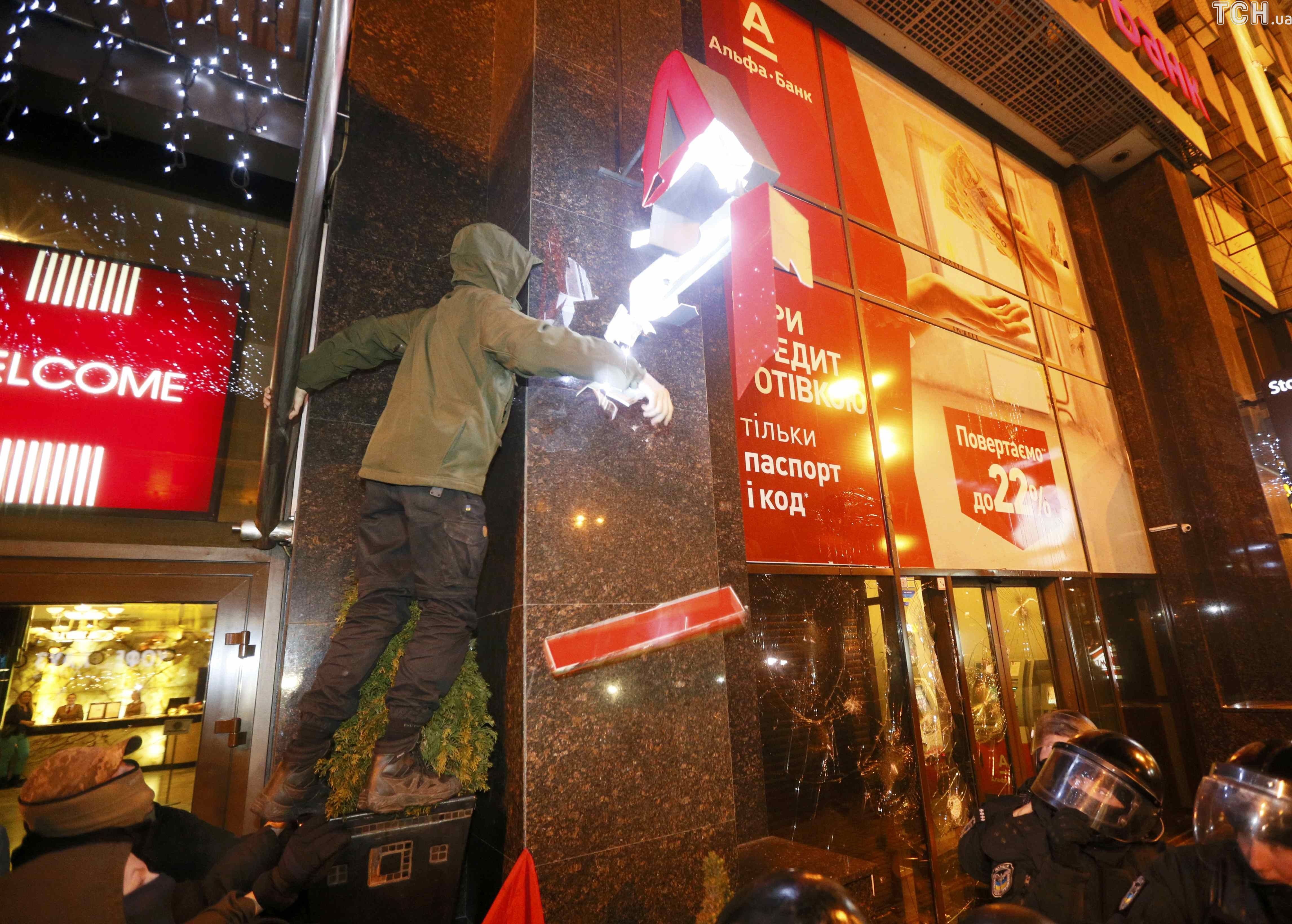 Вернувшись на Майдан Независимости, националисты начали забрасывать камнями здание "Альфа-Банка" и разбили окна и вход в банк. Между правоохранителями и митингующими произошла драка.
