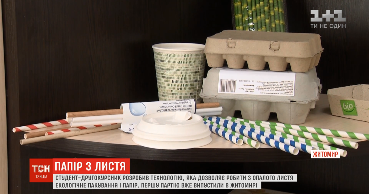 По технологии украинского студента Валентина Фречки, который в прошлом году выиграл гран-при конкурса изобретателей в США, сделали первые опытные образцы бумаги из опавших листьев. Завядшие листья превратилось в упаковки для яиц, трубочки для напитков и свитки крафтовой бумаги.
