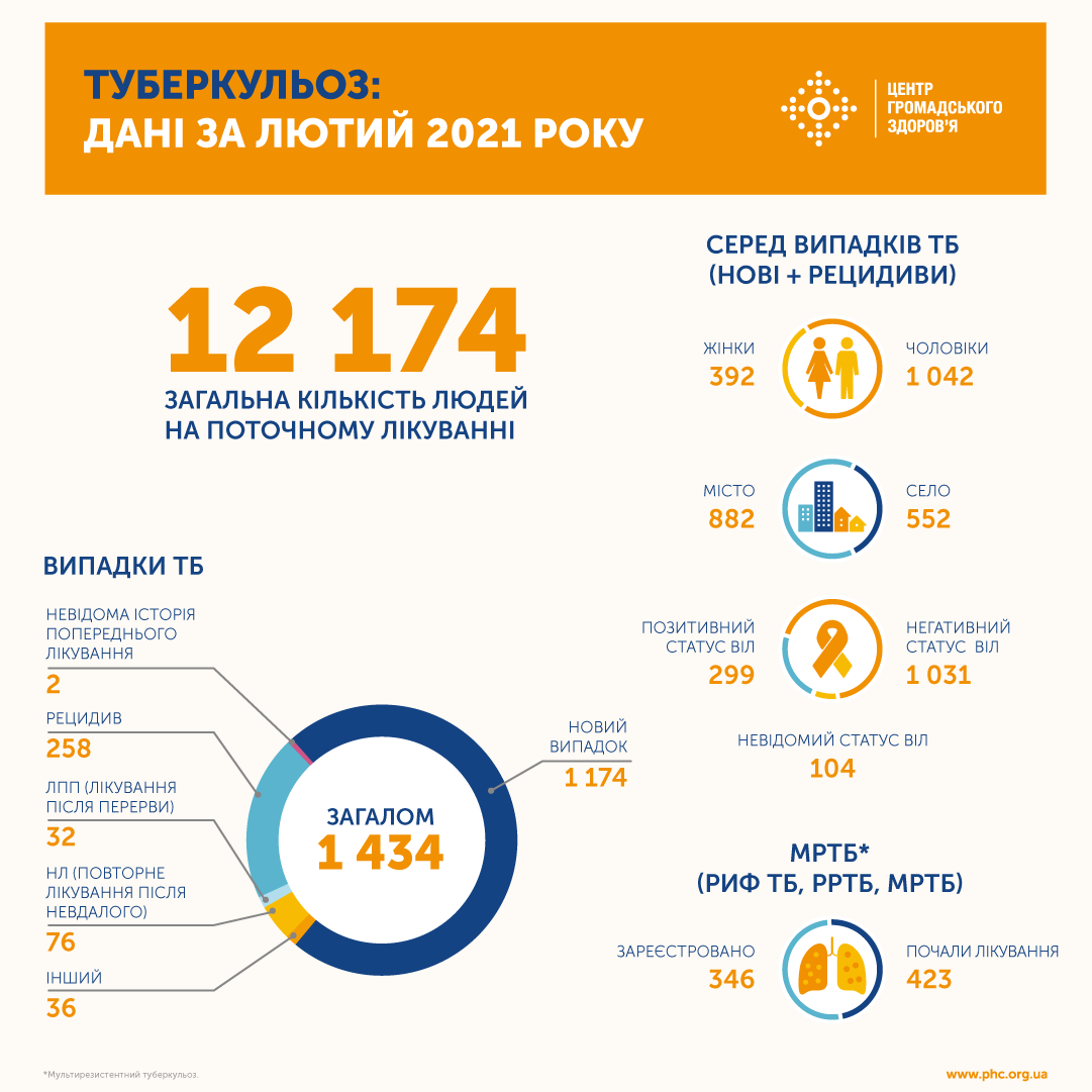 В Украине в течение февраля зарегистрировали 1 434 случая туберкулеза, из них большинство — новые больные. Всего в прошлом месяце от туберкулеза лечились 12 174 человека.