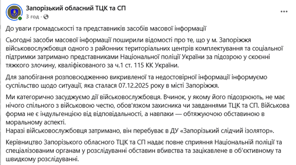 «Сегодня средства массовой информации распространили сведения о том, что в г. Запорожье военнослужащий один из районных территориальных центров комплектования задержан представителями Национальной полиции Украины по подозрению в совершении тяжкого преступления, квалифицированного по ч.1 ст. 115 УК Украины (преднамеренное убийство)», — говорится в сообщении