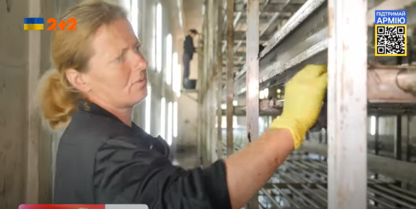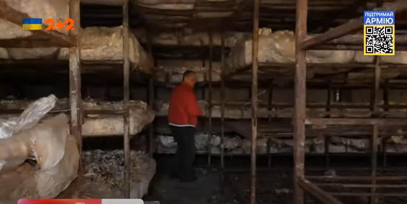 "Это было подготовлено к выращиванию грибов — все пропало. Испортилось, погнило, поцвело. И сейчас мы готовим помещение. Как видите в это помещение попал снаряд, находится он в помещении, пробило крышу, повреждений немного сделал", — показал Николай последствия оккупации .