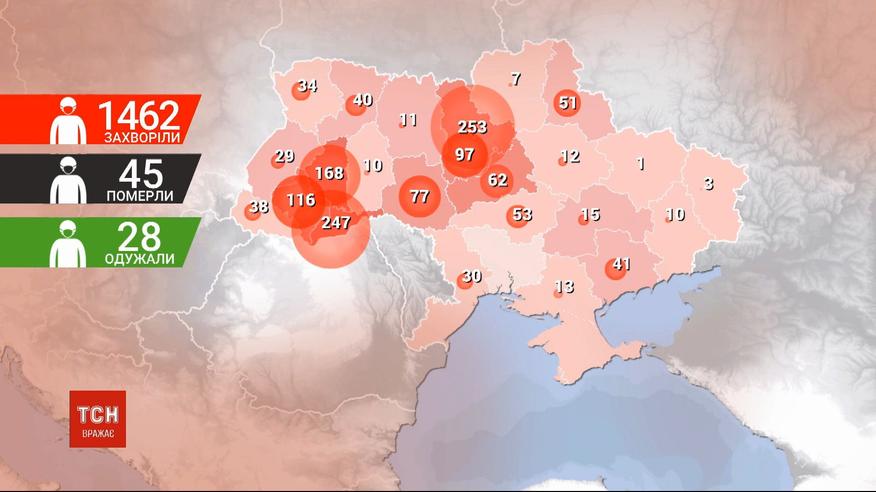 28 человек выздоровели и 45 умерли: в Украине 1462 подтвержденных случаев коронавируса