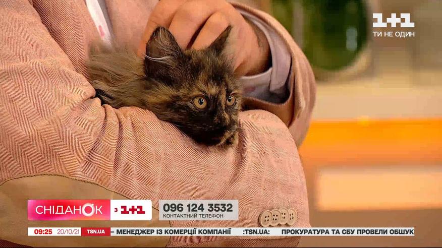 Знакомьтесь, сегодня у нас в гостях Мальвина. Этого милого котенка нашли в мешке у забора приюта. Сейчас ей три месяца. Она здоровая, активная и любознательная. И ей очень нужен дом! Если хотите забрать ее домой, звоните. Номер волонтера на ваших экранах.