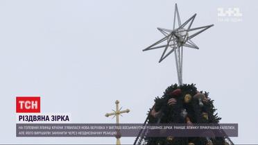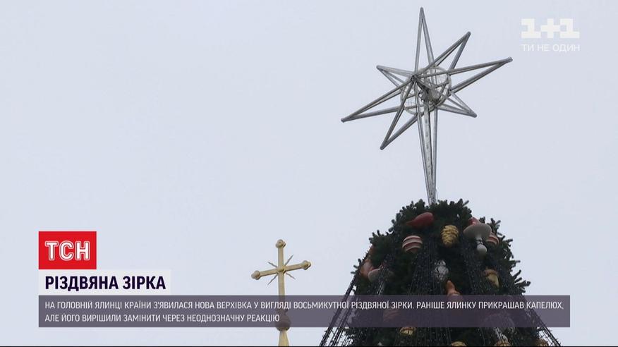 Звезда вместо шляпы. На главной елке страны уже появилась новая верхушка в виде восьмиугольной рождественской звезды. Маковка 4-метровая и весом 60 килограммов. Сделана она из алюминия и гирлянд трех цветов - двух оттенков белого и золотистого. Организаторам новая верхушка обошлась в 75 000 гривен - старая ныне лежит на складе. Заменить верхушку решили после того, как в соцсети раскритиковали макушку в виде шляпы.