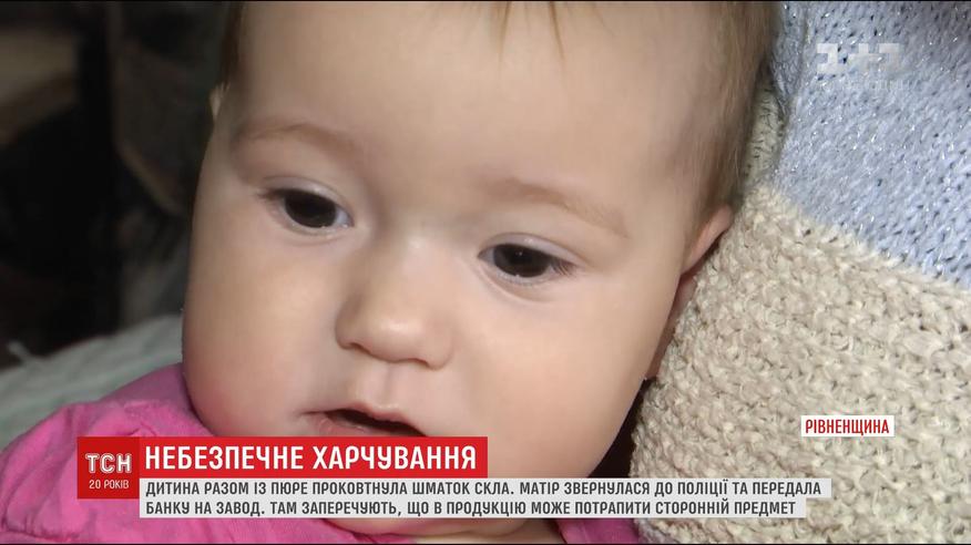 На Ровенщине младенца кормила бабушка и вдруг ребенок есть отказался. Когда же женщина сама решила попробовать приобретенное в магазине яблочное пюре - с первой же ложки почувствовала на зубах кусок стекла. И оказалось - такой же малыш успел проглотить.