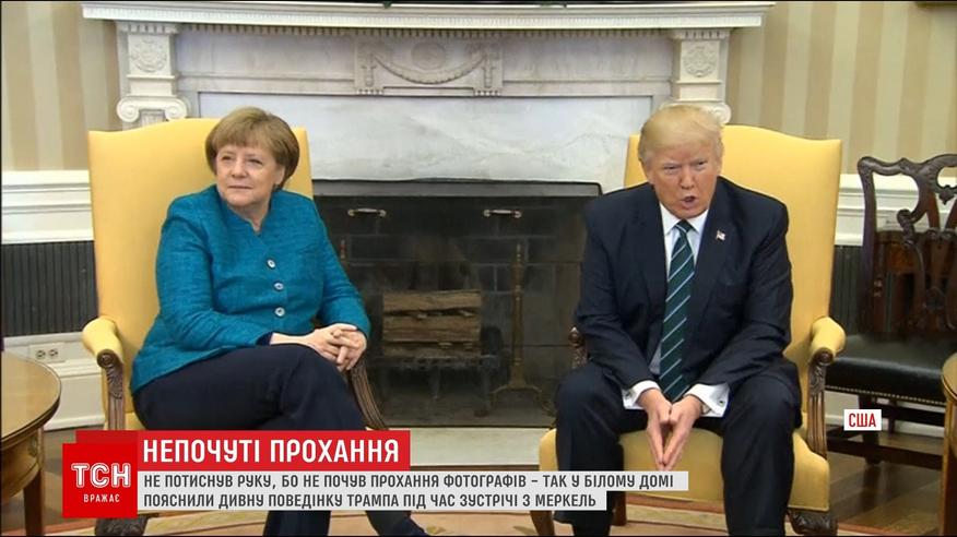 Он не расслышал вопрос - так администрация президента США попыталась сгладить странное поведение Дональда Трампа на встрече в администрации президента США. Во время протокольной съемки в Белом доме американский глава проигнорировал просьбу фотографов пожать руку немецкому канцлеру. Когда Меркель спросила у Трампа, то снова сделал вид, что ничего не слышит.