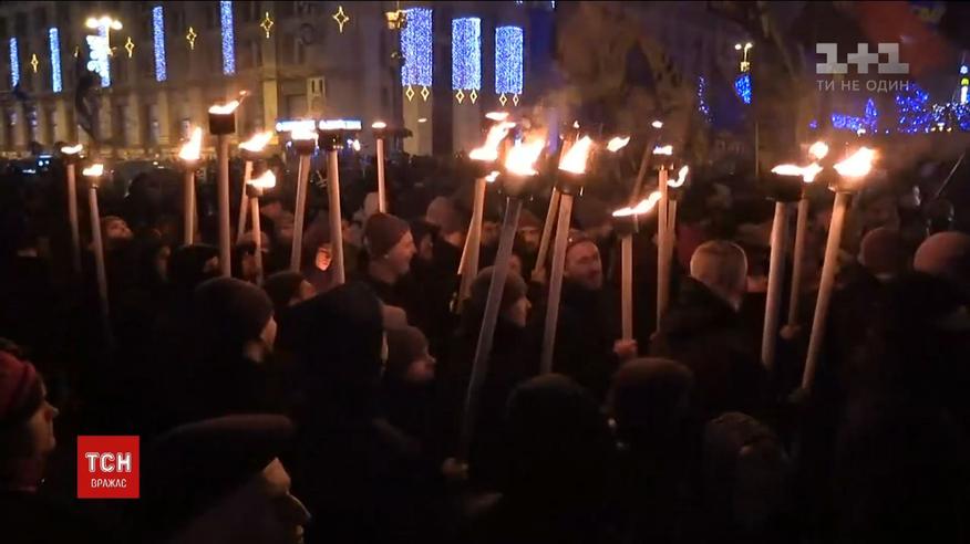 Факельное шествие в честь дня рождения Степана Бандеры просто в эти минуты движется по центру столицы. Несколько людей с зажженными факелами отправились час назад от университета Шевченко.
